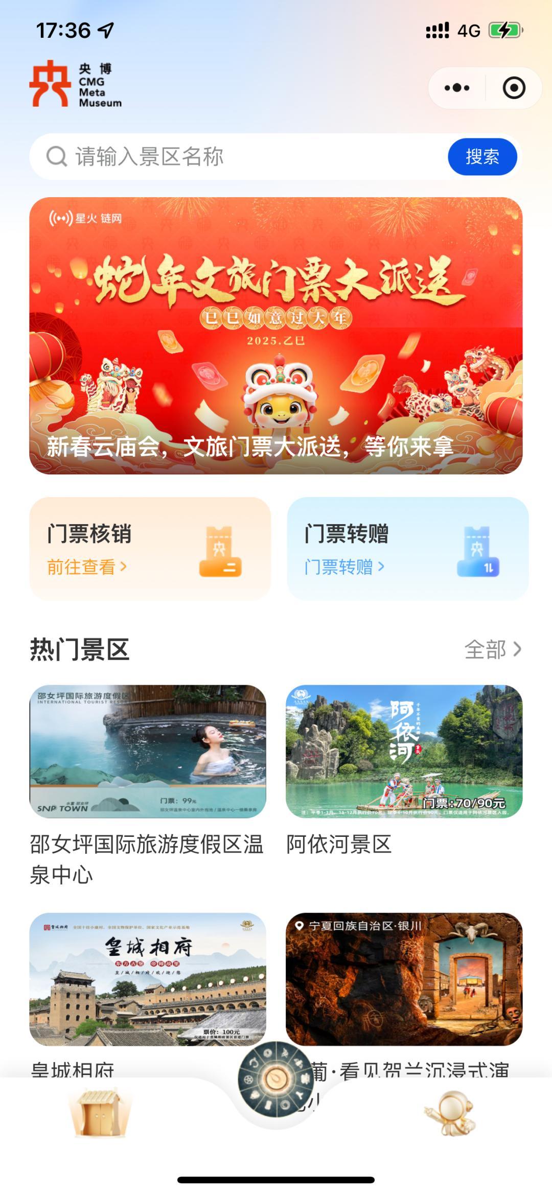 繼2024年龍年雲廟會創下超170萬次訪問、70萬張門票發放的佳績後,2025年“央博新春雲廟會”再度來襲,爲期一年活動,打造2025文旅年,通過“星火·鏈網”技術實現門票上鍊覈銷全鏈路數字化,並攜手全國80%以上4A級景區,派發百萬張文旅門票及優惠券,全面響應國家提振消費、繁榮文旅經濟的戰略部署。