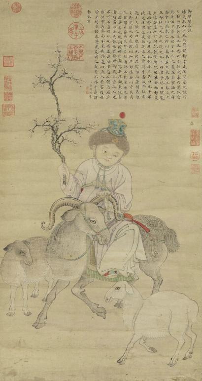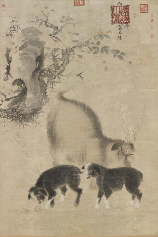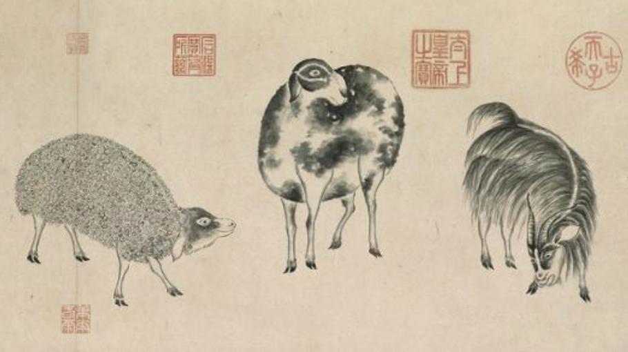 乾隆的這幅《三陽開泰圖》,在畫題立意上仿照明宣宗朱瞻基的作品,而造型、畫法上參考了郎世寧的作品,繪製出了這幅具有新春祈福寓意的仿古畫。