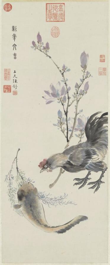 這幅《新年大吉》畫折枝辛夷、柳條,配以公雞、鯰(nián)魚。立意非常新穎,不拘常法,也是一幅年節應景畫。“鯰”“雞”取“新鯰大雞”的諧音,爲“新年大吉”之意。