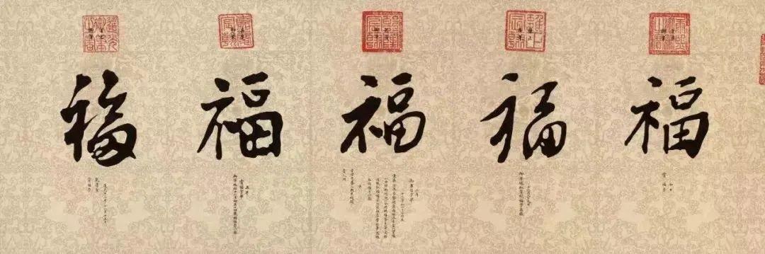 《御筆五福圖》選用了康熙、雍正、乾隆、嘉慶、道光(從右至左)五位皇帝親手所寫的“福”字製成“五福圖”,祝願五福臨門、福星高照。