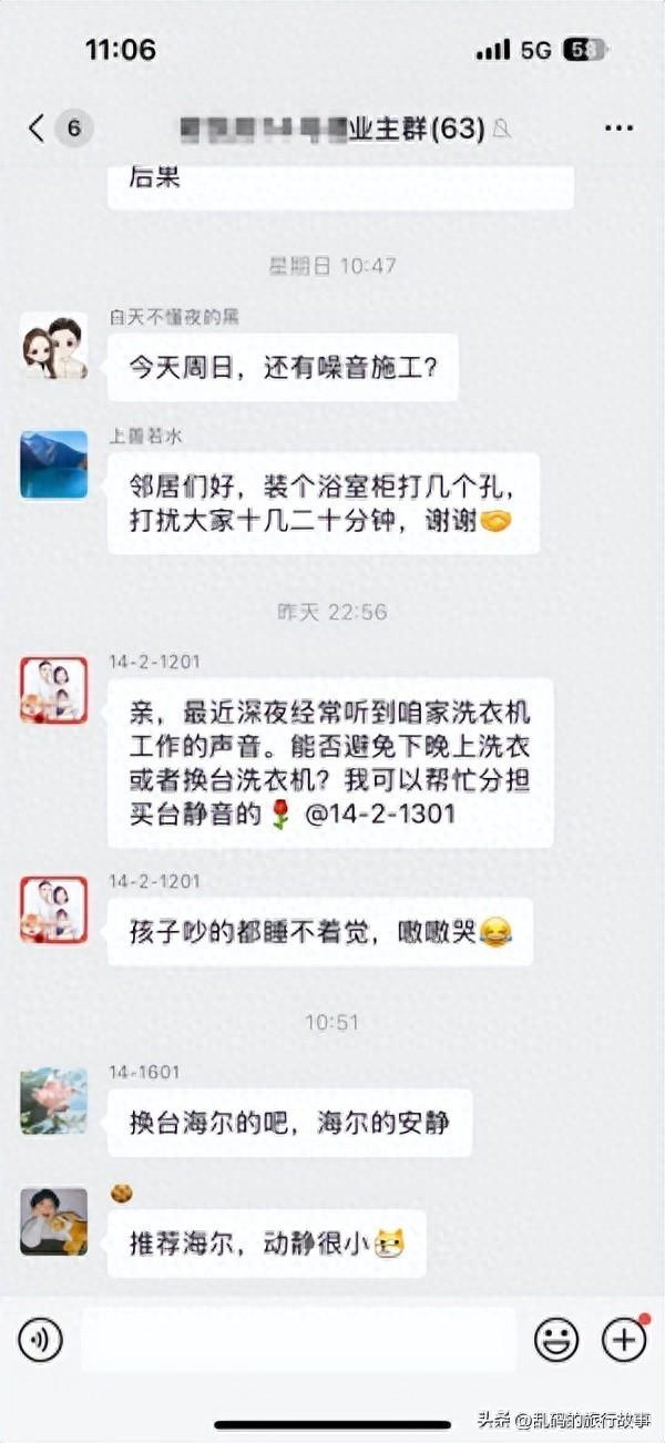 近日,某小區業主在微信羣中反映,樓上住戶深夜使用洗衣機時噪音擾民的問題引發熱議。該業主表示,洗衣機運轉產生的巨大聲響嚴重影響了家人的正常休息,無奈在羣內提議:“換臺洗衣機?我可以幫忙分擔買臺靜音的。”