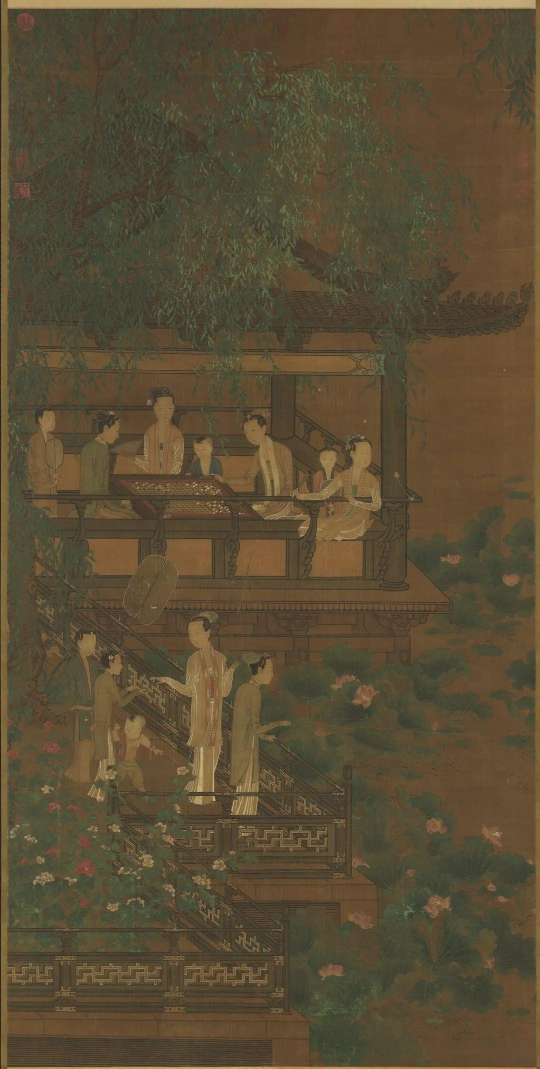 圖 | 五代·周文矩(傳)《荷亭奕釣仕女圖》| 現藏於臺北故宮博物院