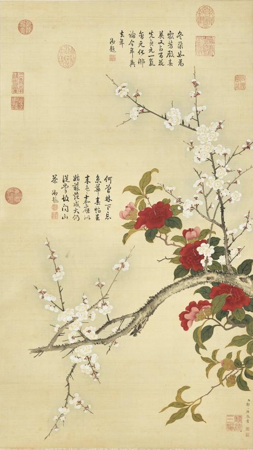 古代許多畫家都曾畫過梅花,或是將梅花與山茶、水仙這些同屬於冬日的花朵並立,讓畫面的色彩更加豐富。傲雪的妍麗紅、高潔的清麗白、恬淡的可愛粉……它們互相映襯,讓畫面的冬景甚至都有了怡人的溫度。