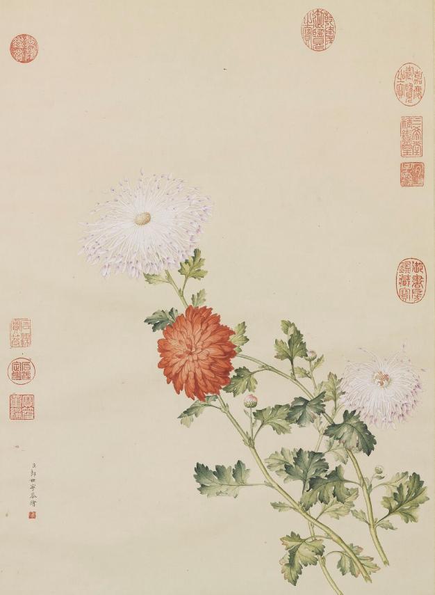 在古代畫家的筆下,奼紫、雪白、淺粉的各色菊花競相開放,蝴蝶也不禁爲之駐足。