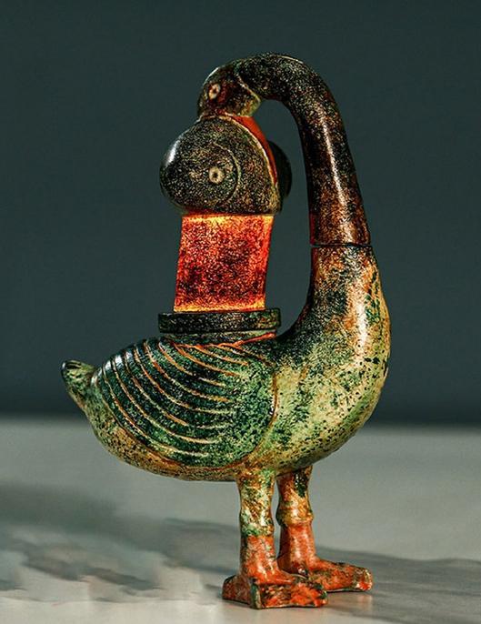 燃燒時油煙經雁頸、魚身導入雁腹清水中淨化,