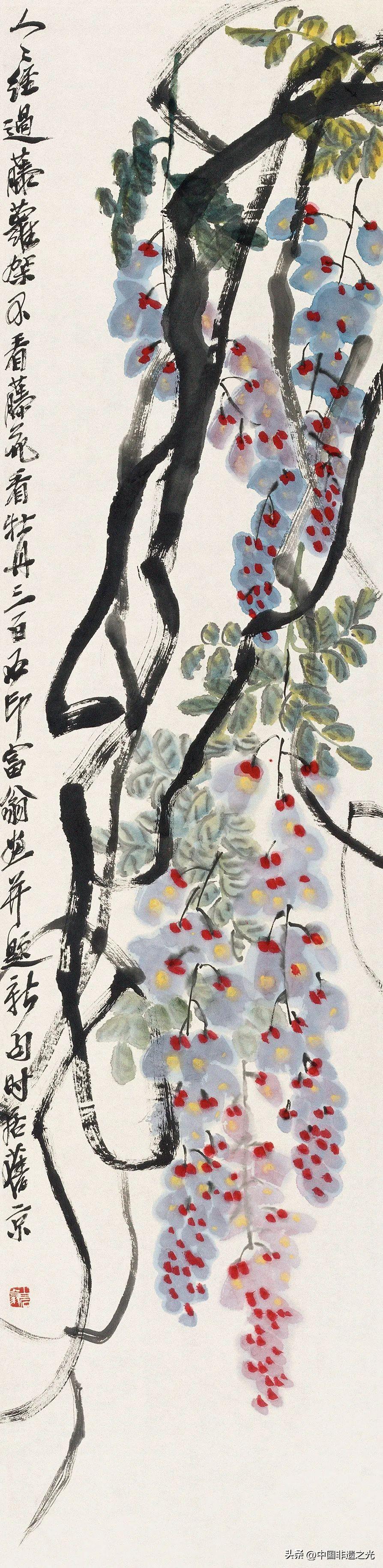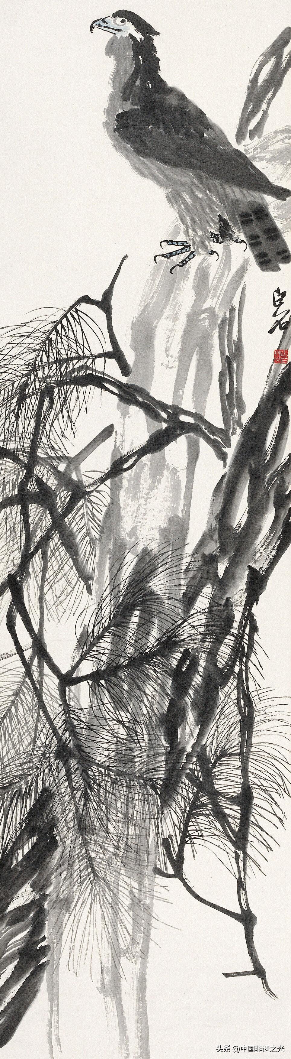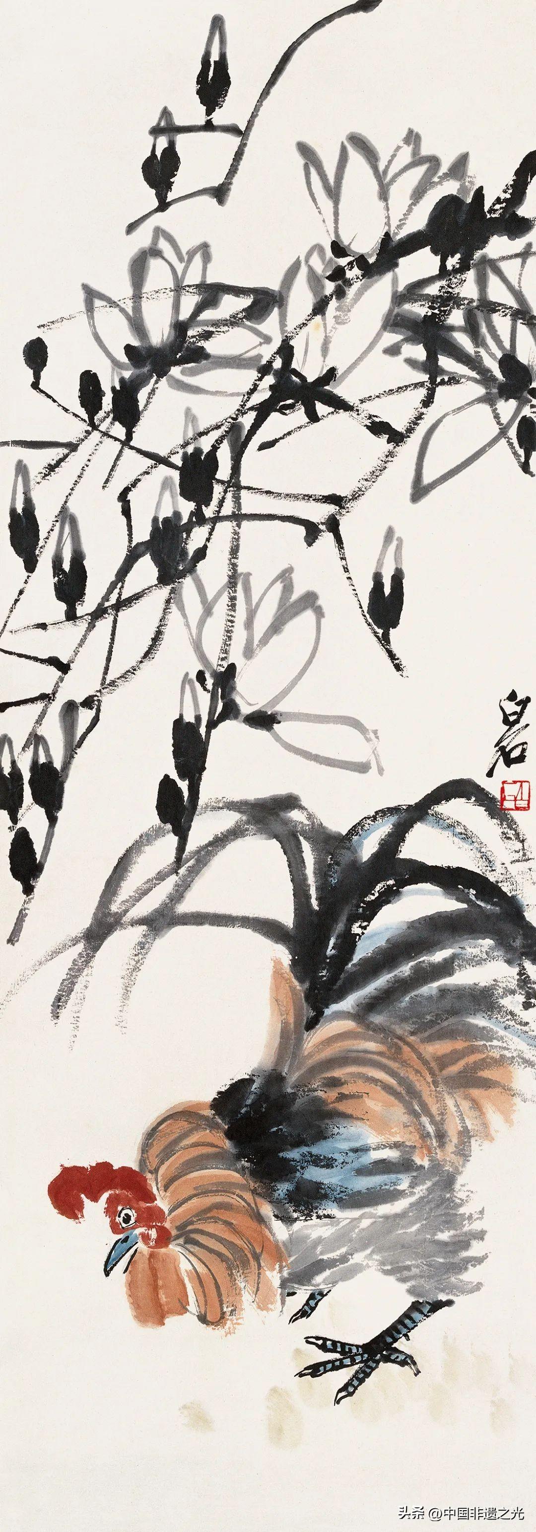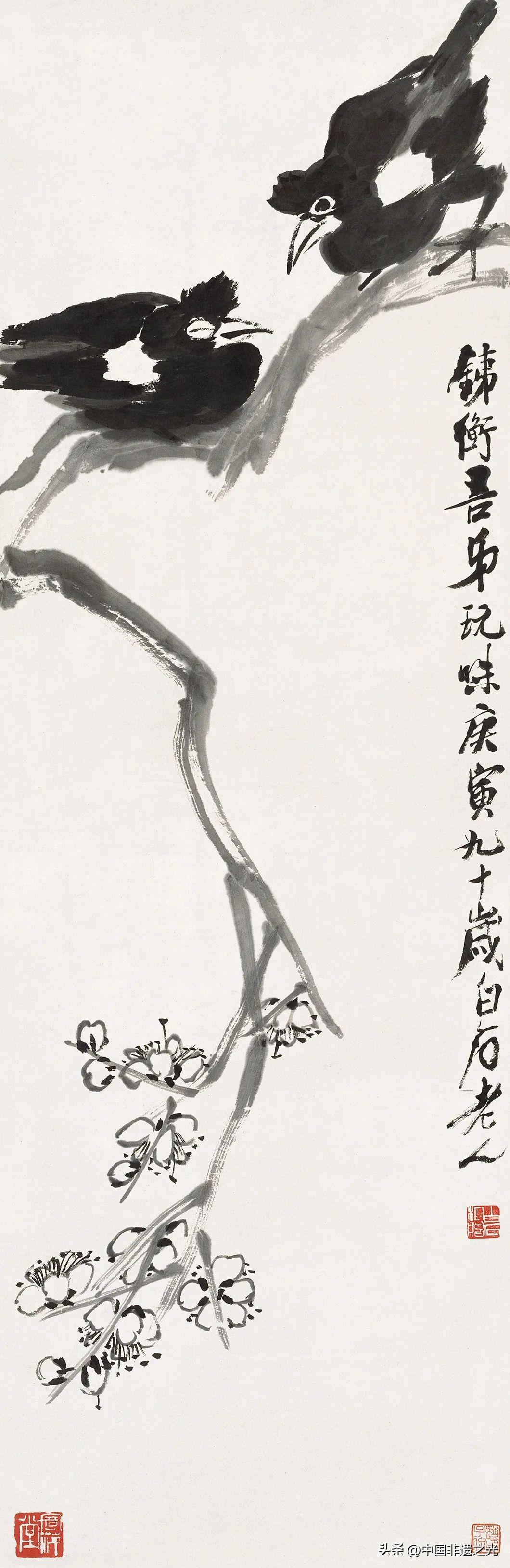 冬,原是一片蕭索之象,但在齊白石的畫中,無論是以梅花爲代表的花木,還是以蒼鷹爲代表的禽鳥,都透露着頑強生長的倔強。齊白石以獨到的筆觸,使畫面兼具冬季蕭瑟肅殺的蒼勁之力和通透輕盈的疏朗之美,在“冬之舞”中,彰顯冰雪不荒,寒梅不孤的達觀自信精神。