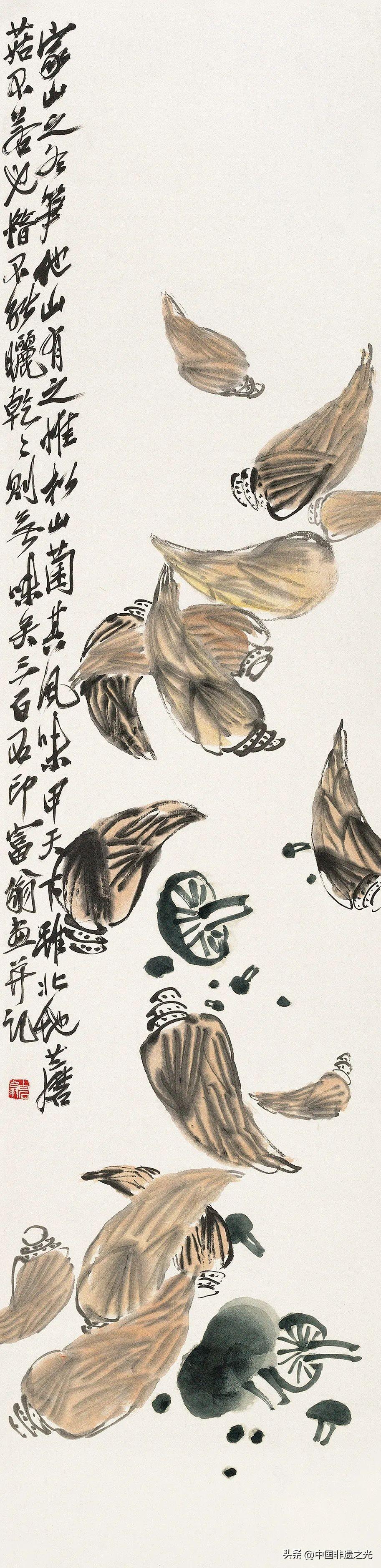 從民族文化土壤中成長起來的齊白石,將樸素的平民趣味與銳意的創造精神發揮到與世紀特性完美契合的境地。他關注歷代文人不常畫之物,以大膽筆觸配合墨色變化、以農民情趣摻融金石筆法,在工寫兼有、形神必備中賦予四季朝氣,無論是春桃夏荷,還是秋葵冬梅,一任自然、生動傳神。