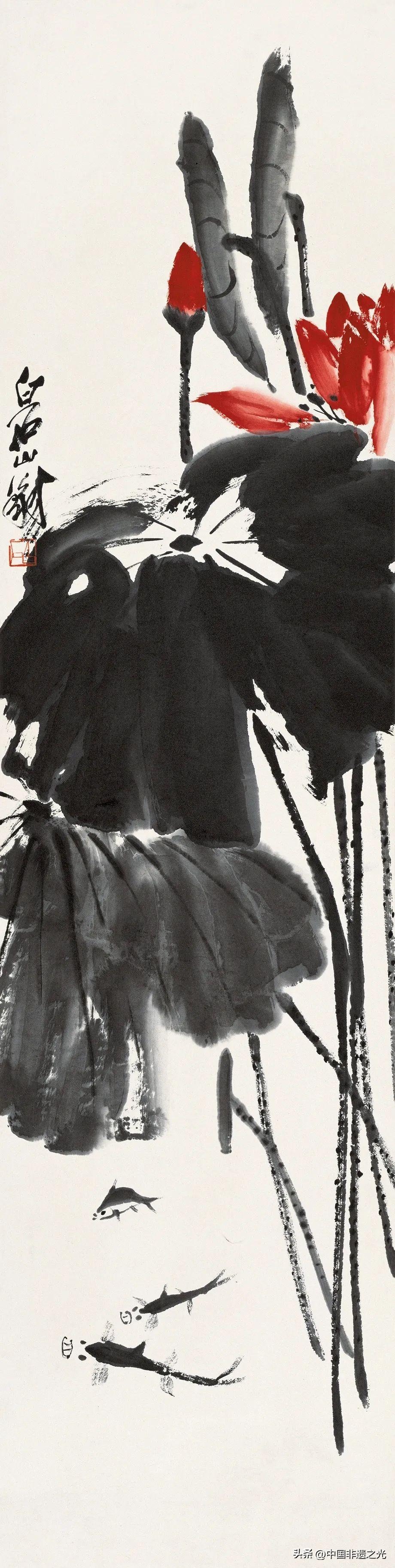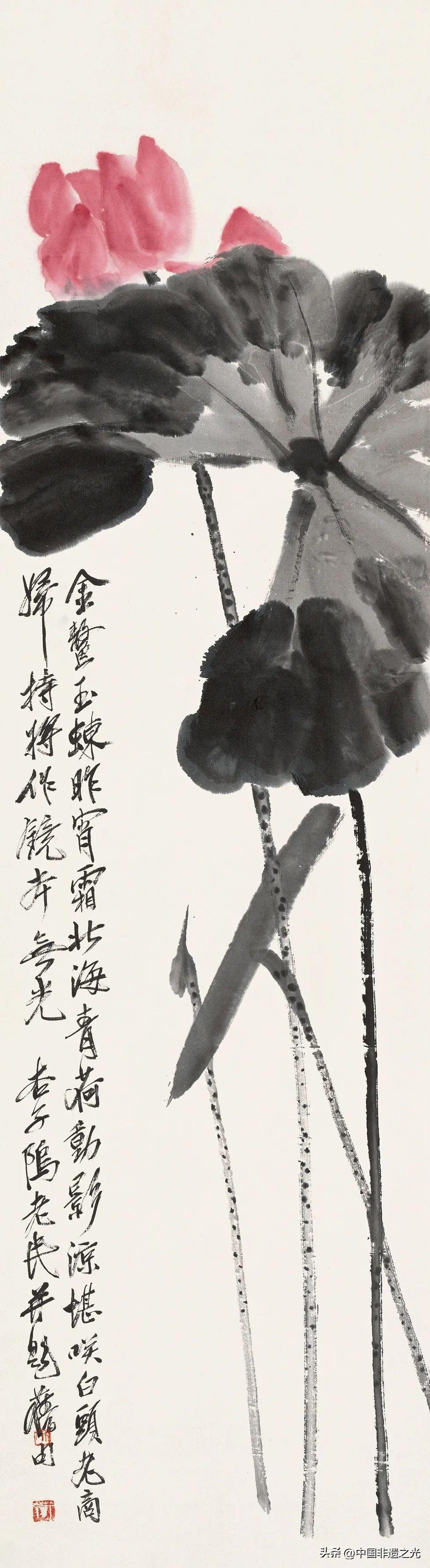 畫荷花無疑最能釋放和表達。齊白石筆下的夏日荷花多爲“紅花墨葉”,用飽滿、鮮豔的洋紅直接寫荷花,荷葉酣暢奔放、純墨渲染,用焦墨寫就荷梗,在對比變化中形成鮮明奔放的視覺效果,表現出濃郁的民間審美趣味,傳達出強烈的生命勃發之感。