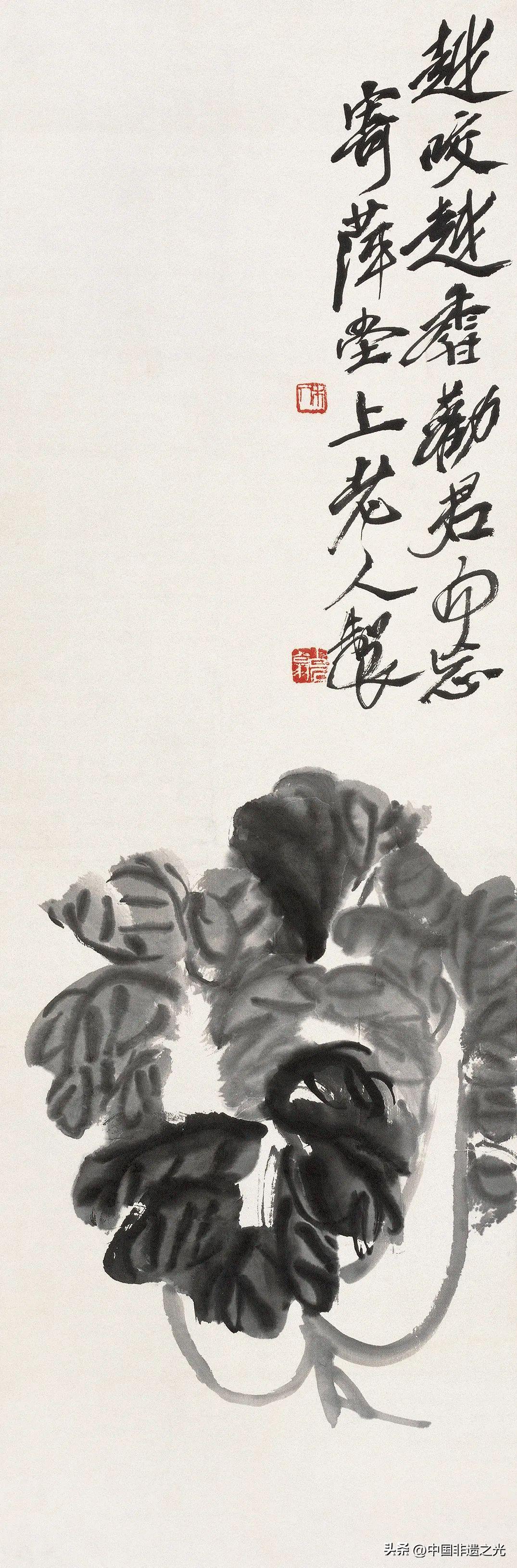 在齊白石筆下,與農村生活、與兒時回憶、與若干引動生活真情相關的冬日事物,都可以直接入畫。冬天的白菜,看似平淡無奇,在他的筆下卻特別的鮮活,透露出旺盛的生命活力和濃郁的生活氣息。