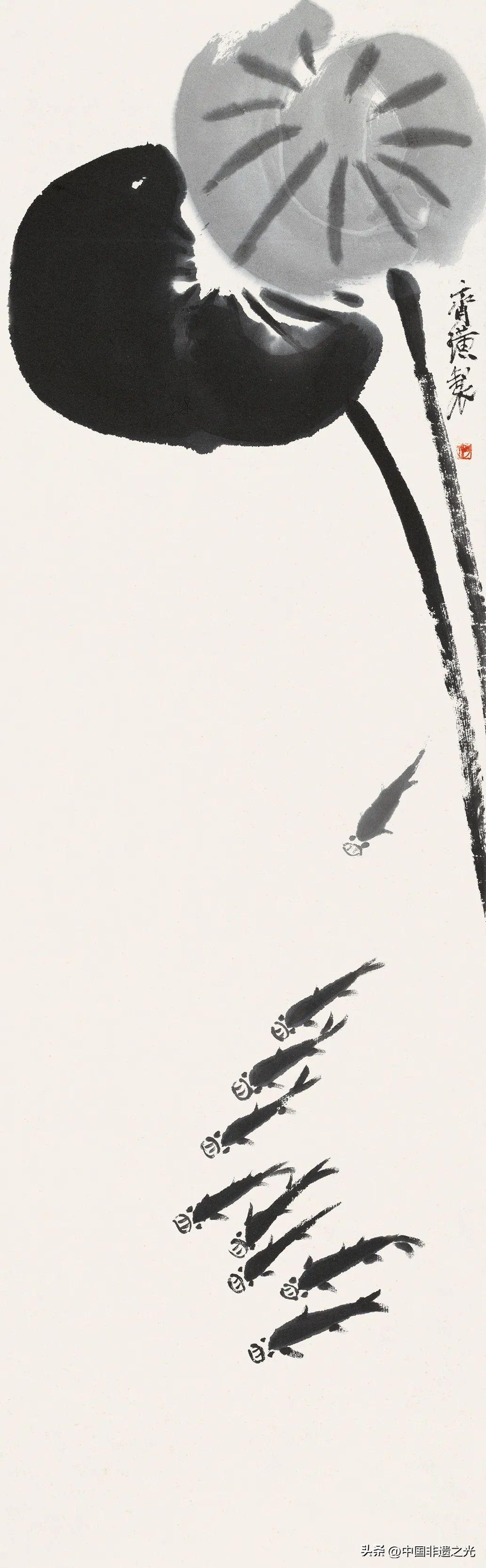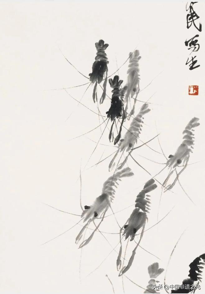 “衰年變法”後,齊白石提出“妙在似與不似間”的藝術理論,既不主張太過具象,也不贊成妄意而爲,而是聚焦於將繪畫對象的主要特徵以誇張的手法表現,通過放縱的筆墨和對比強烈的構圖,將寫意畫推向了極致,營造一方形神畢現、意趣盎然的畫中天地。