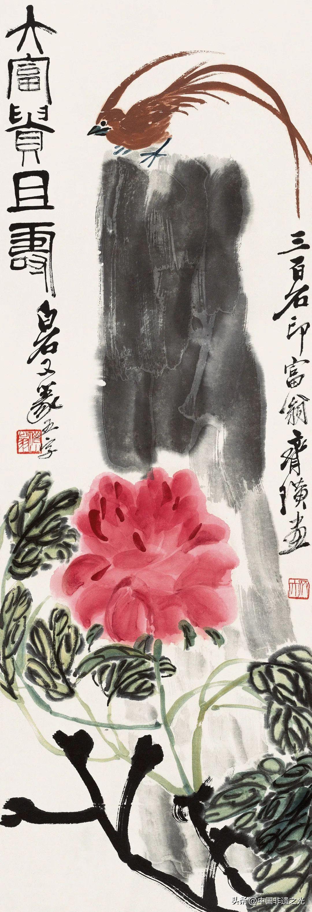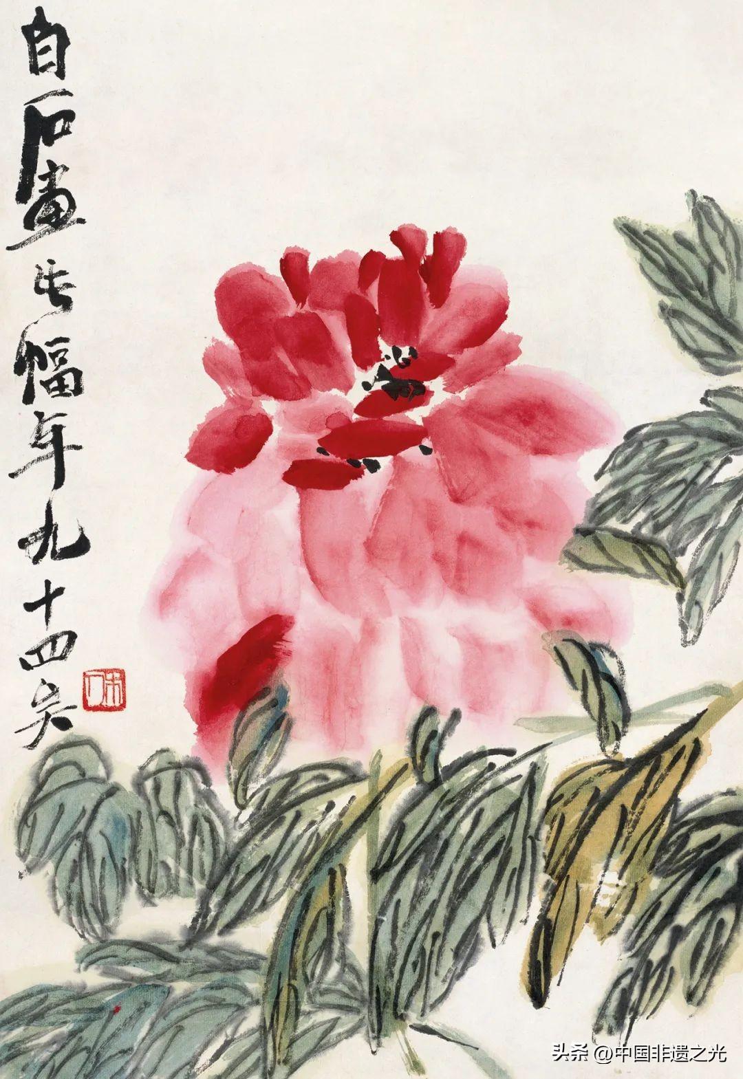 桃、杏、梨、山茶……各種春花出現在齊白石筆下。其中,牡丹是他最喜歡的花卉之一,齊白石所畫牡丹筆墨酣暢,拙樸有力,典雅之餘富有情趣,作品風姿動人,生動刻畫出了牡丹搖曳的韻律,寓意吉祥富貴。
