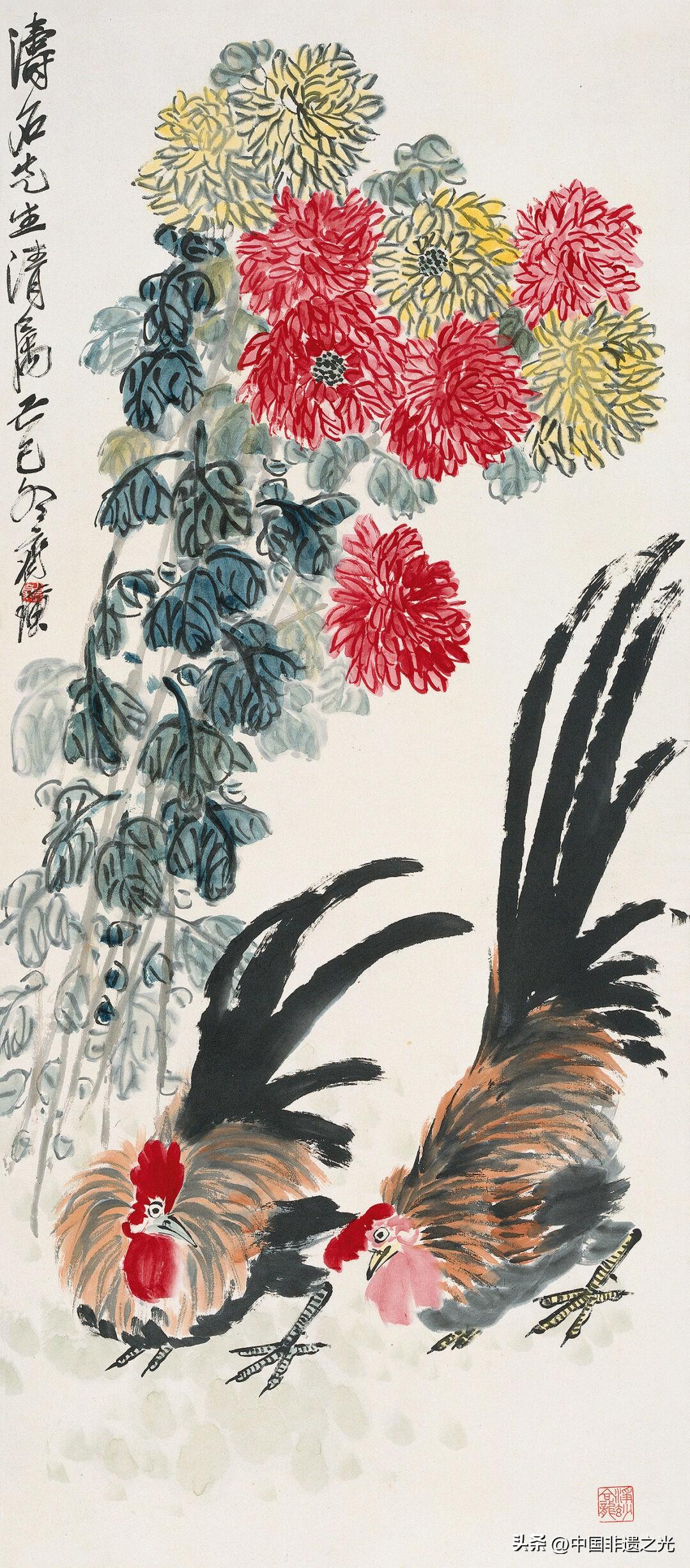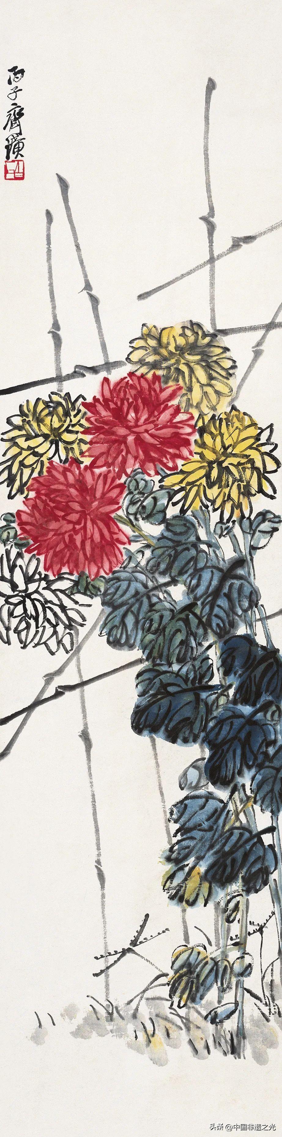 菊花是齊白石最常畫的題材之一。關於菊花,齊白石有自己獨特的觀察角度和表現方法,不是華麗絢爛的,也不是風情萬種的,而是用簡單的造型和疏鬆的佈局營造出生活化的氛圍,在平凡的花枝之間流露出一種淳樸直率的天真情懷。
