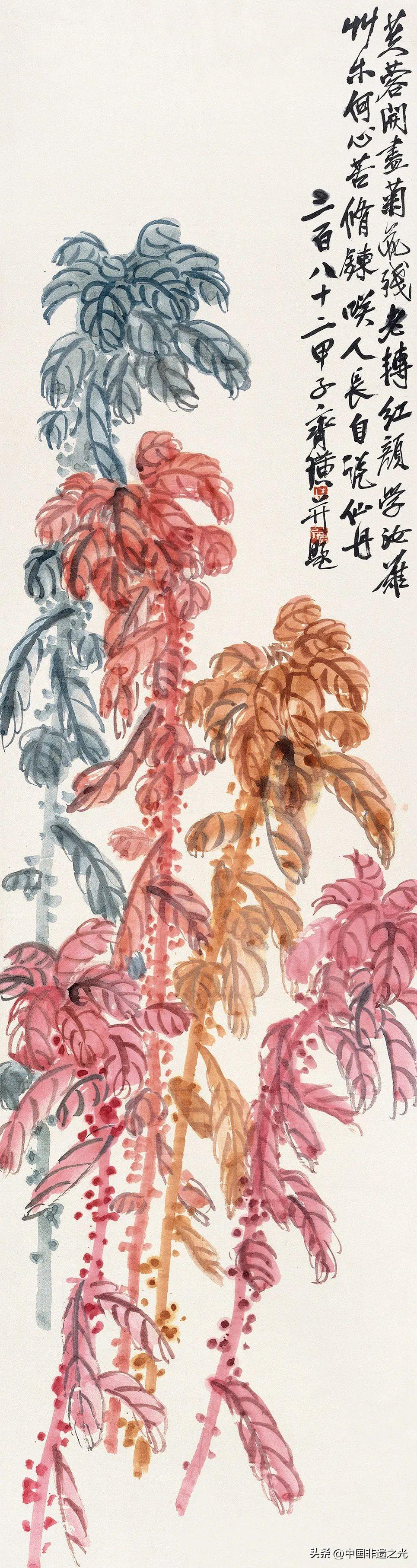 齊白石的秋,是“秋氣堪悲未必然”的闊達,也是“登高時近倍思鄉”的感傷。與主要通過熱烈的紅色象徵夏季不同,在表現“秋之歌”時,齊白石雖用色冷靜,卻巧妙地以多種繪色形成強烈的視覺衝擊;同時融入寫意畫法,寄情於筆,用濃而不濁的墨,輔以細筆勾勒,賦予畫面獨特的韻味。