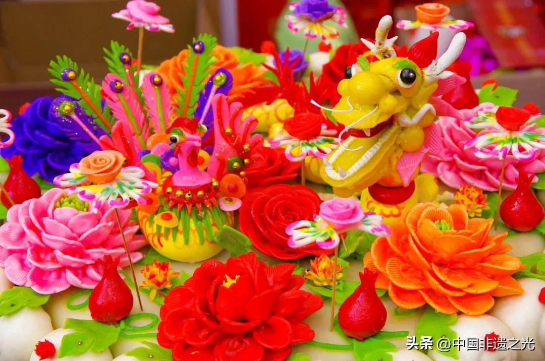 麥粉被捏做龍鳳、花果、祥獸等生動形態