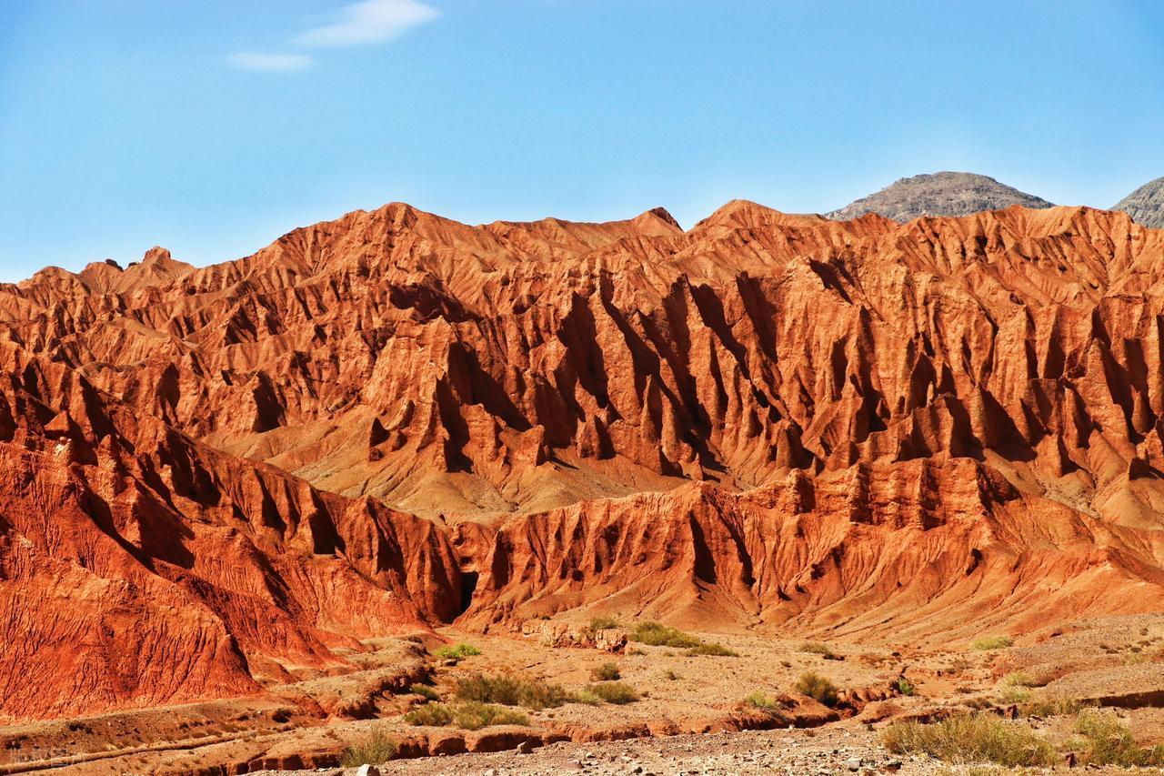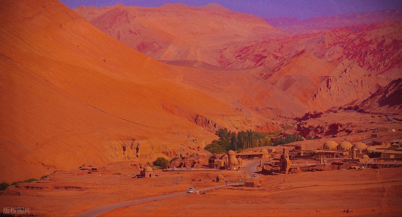 汽車駛過吐魯番盆地,那火焰山便赫然撞入眼簾了。山體赤裸,深赤如燒透的鐵塊,褶皺層層疊疊,蜿蜒起伏,如凝固的火焰,又似大地裸露的筋脈。遙望山腳,空氣被灼烤得顫抖不已,景物在熱浪中浮動扭曲,彷彿全被裹入一片巨大的、無形的火焰裏,世界只剩下滾燙的顏色和晃動的影子了。