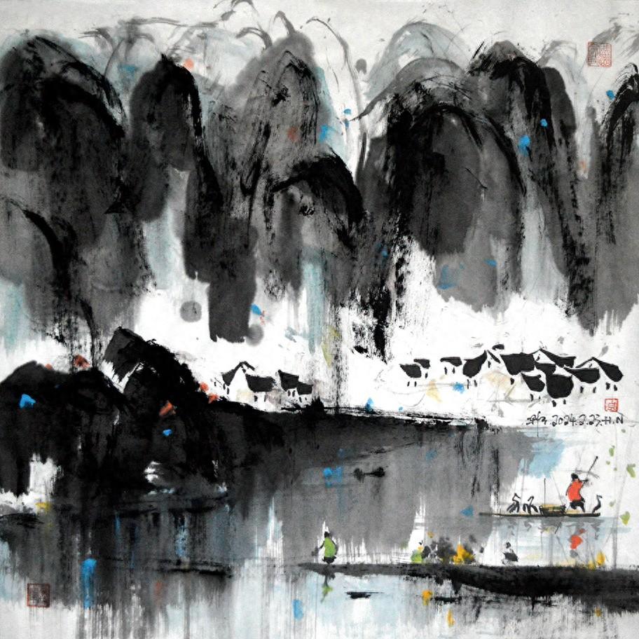 提起畫筆又想起陽朔的山山水水,是表達不盡還是表現程度有限而始終未能如願因而念念不忘,不得而知。有一點是肯定的,那就是濃郁的情懷只是溢出那麼一撇而沒能瀟灑的、淋漓盡致的走一回發泄個精光過癮,不想像蠶寶寶吐絲一樣慢慢騰騰,尤其是用水墨畫創作表現這富有詩意和靈氣的灕江山水。如果只是表現出它的地貌特徵而沒有感受的轉碼錶達,那還真不如看看實景照片來的感受印象深刻。