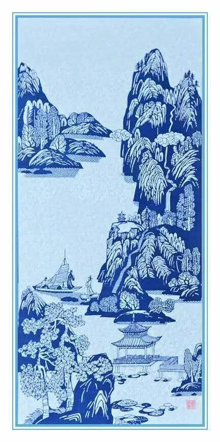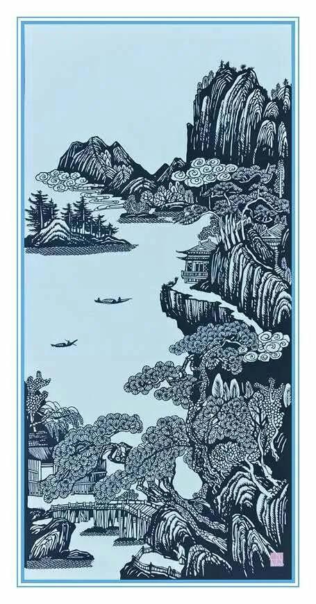 山水剪紙最精妙處,在於用二維平面演繹三維意境。老藝人常說 “一剪分陰陽,兩剪見遠近”,寥寥數刀便能區分山石的明暗向背。粗壯的折線表現嶙峋石峯,紅紙的留白恰似江面粼粼波光,虛實相生間,竟比油畫更顯空靈。這種 “以剪代筆” 的智慧,讓靜態的紙張有了風雨流動的生命力。