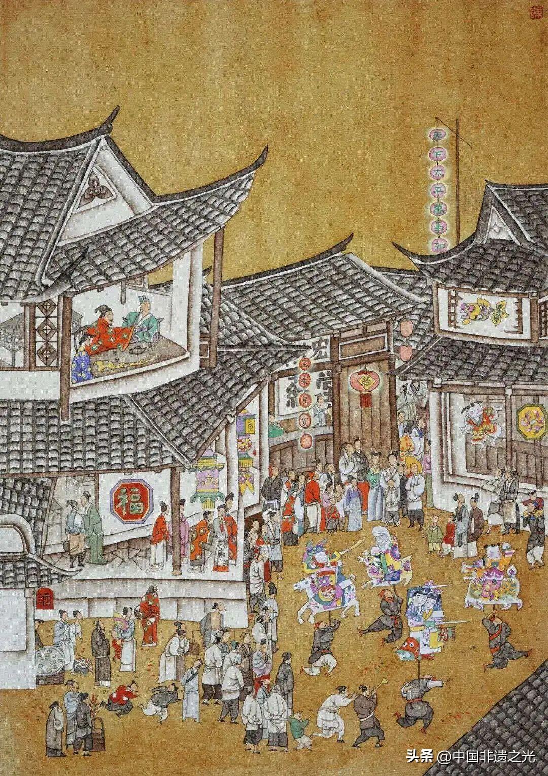 色彩絢麗而沉穩,將明代市井生活的奢靡與喧囂表現得淋漓盡致。