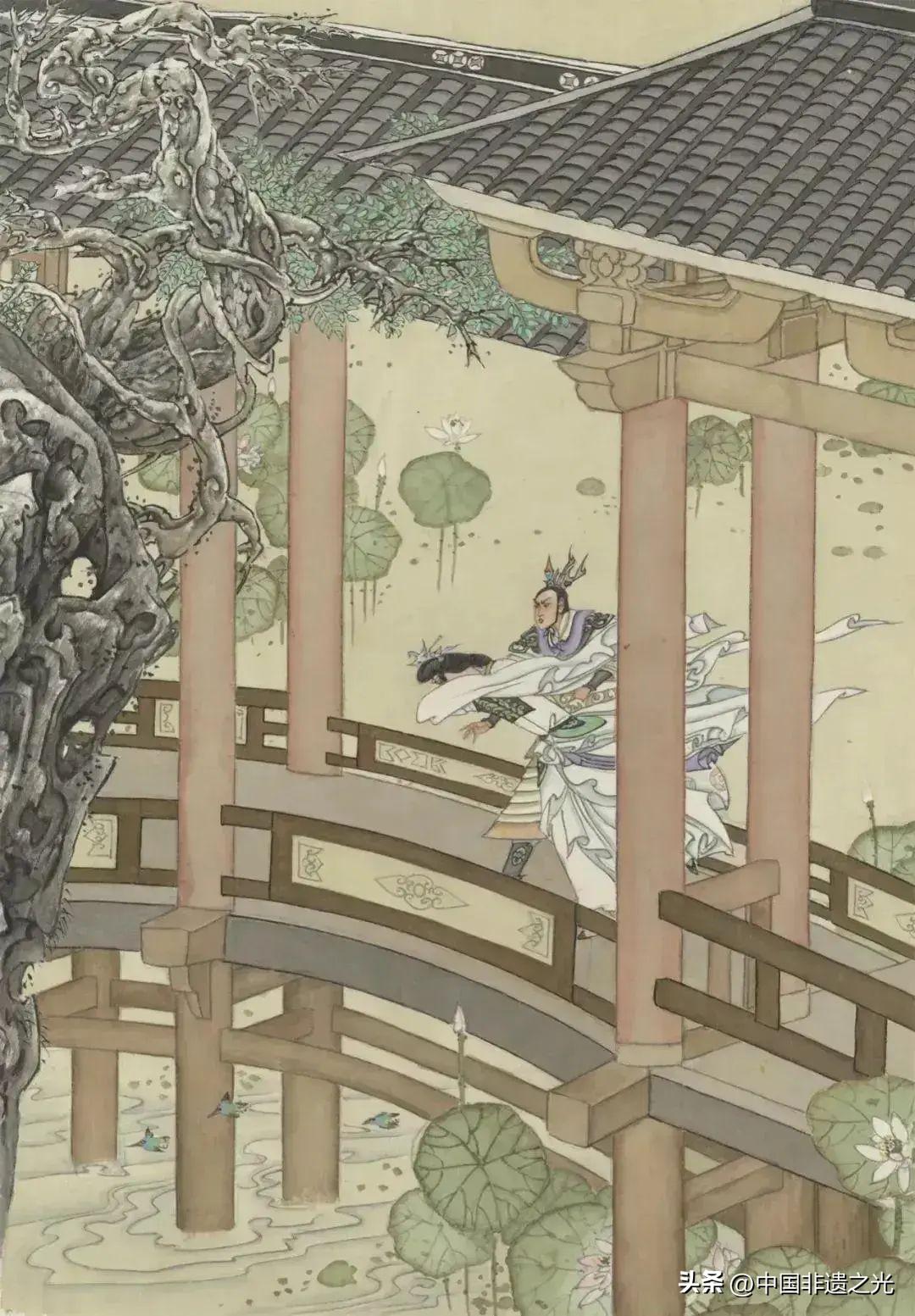 在表現“鳳儀亭”這個經典場景時,最初他將呂布和貂蟬設計在荷花盛開的曲橋上,畫面唯美動人。