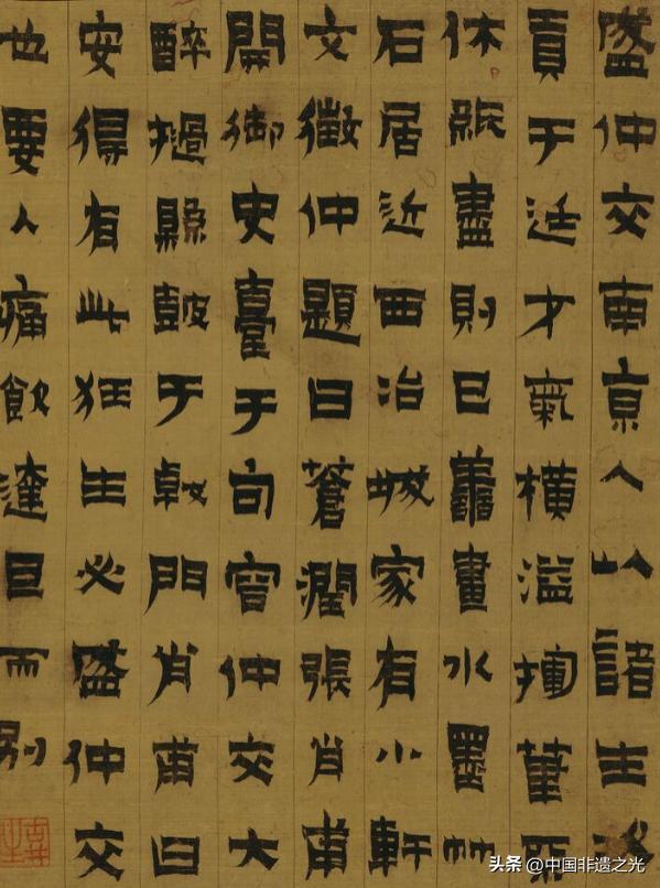 他獨創一種隸書體,自謂“漆書”,另有意趣,又謂金農體或冬心體,筆畫橫粗豎細,撇飄逸而捺厚重,字體多呈長方形,頭重腳輕,甚是好看。
