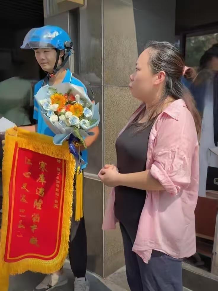 9月2日上午,知恩圖報的陳秀華來到餓了麼潤澤園站,向自己的救命恩人劉旭送上了錦旗、鮮花和紅包。陳秀華當衆表示,自己的第一次生命是父母給的,第二次生命是劉旭給的。