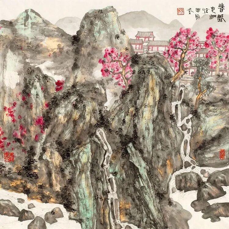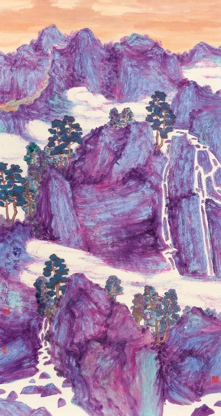 牛克誠先生的彩墨寫意山水畫創作,實現了中國傳統繪畫色彩體系研究的縱深發掘:以山水意象的學理探索與造境實踐,銜接了“五行”哲學觀與“五色”體系的內在關聯,在彩墨語彙上巧妙駕馭色相色溫,活化延續了唐代“二李”北宗畫風及淺絳山水、青綠山水傳統,拓展了東方審美意蘊。