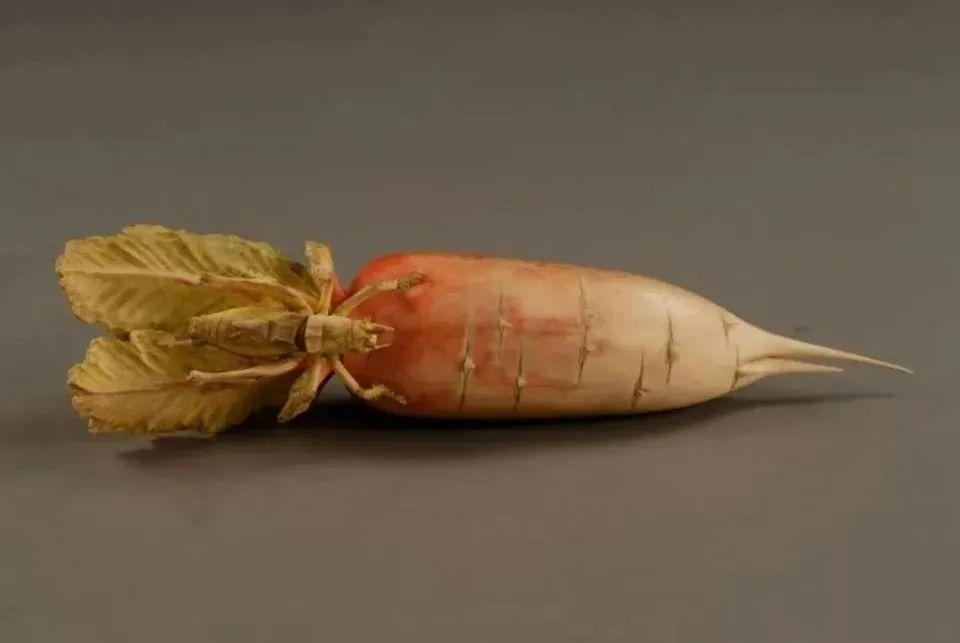 陝西曆史博物館收藏的象牙蘿蔔,通體由象牙琢成,長20釐米,蘿蔔上立一螞蚱,似正在咀嚼鮮嫩莖葉,但似乎又怕自己被意外襲擾。蘿蔔襯以稀疏的莖葉,增加了造物的情趣,造型飽滿,栩栩如生,呈現出一種生機盎然的景緻。