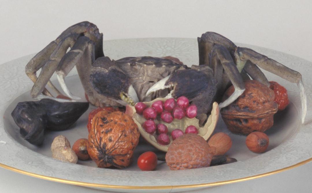 盤中果品不但酷似實物,而且都具有吉祥含義,如螃蟹寓意“一甲”,即科舉殿試第一;荔枝樹有“經四百餘年猶能結實者”之說,象徵長壽;核桃、石榴是多子多福的象徵;而棗、花生、瓜子等則寓意“早生貴子”