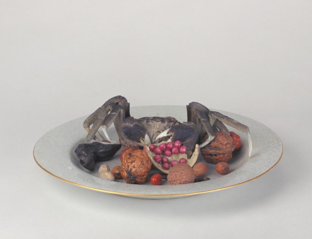 粉彩像生瓷果品盤,高6.5釐米,口徑22釐米,足徑12.3釐米。盤心爬伏一隻螃蟹,四周散落核桃、紅棗、荔枝、荸薺、石榴、花生、蓮子、瓜子、櫻桃、菱角等。