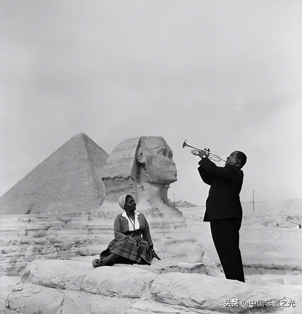 1961年,爵士樂之父路易斯·阿姆斯特朗在金字塔前爲他的太太吹奏樂曲
