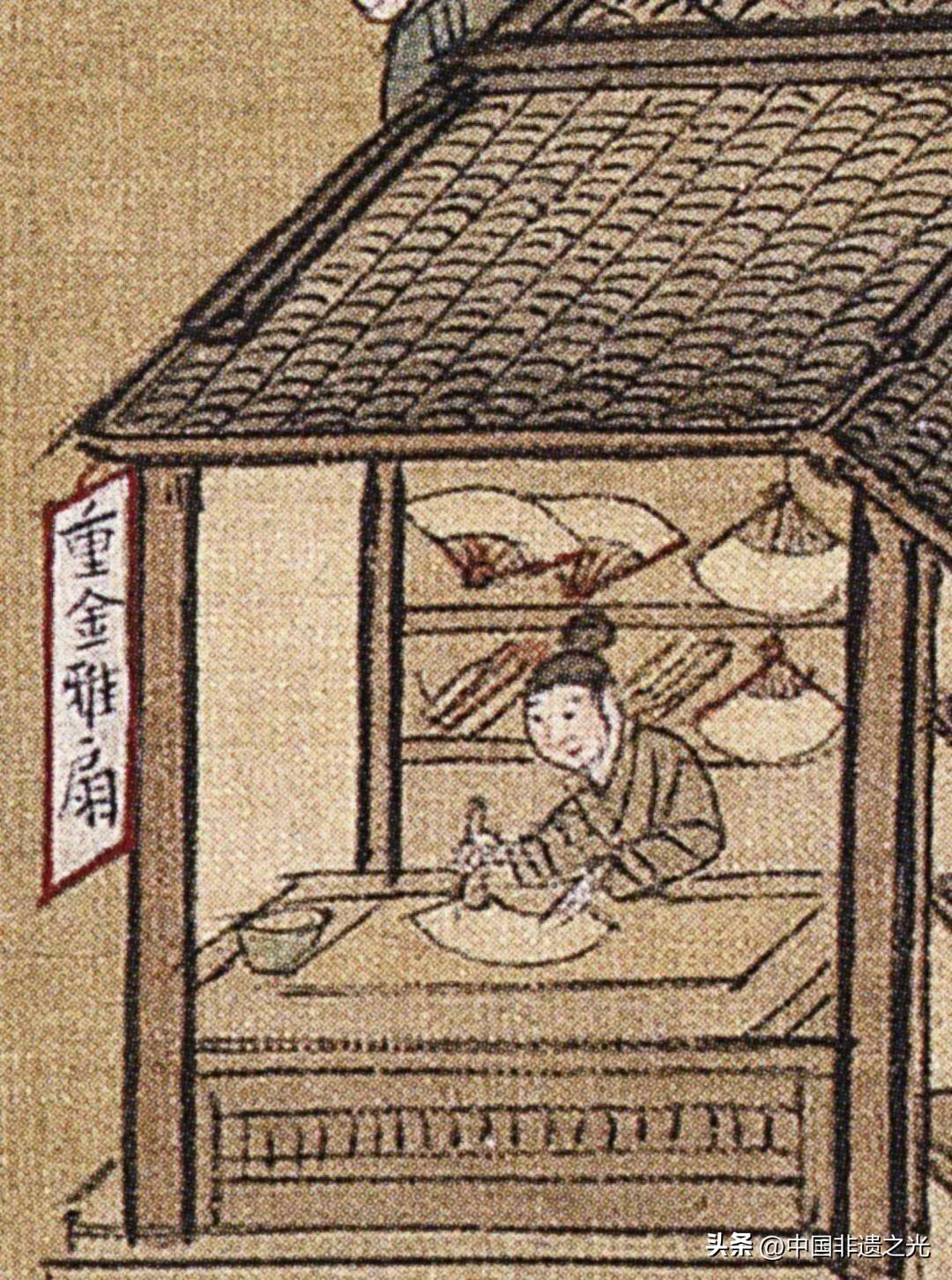 南宋吳自牧《夢粱錄》書中還特別提到臨安城掛招牌的賣扇名店,其中就有“周家摺疊扇鋪”。可見南宋時已能夠自制自銷摺扇,有專門性製作摺扇的人員和商鋪,並在衆多扇鋪中佔據一席之地。