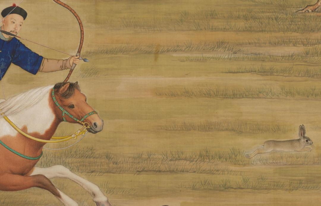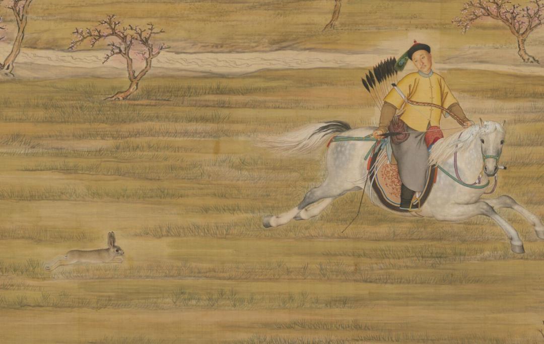 畫中,時年45歲的乾隆皇帝一身戎裝,弓開如滿月,箭去似流星,正在奔馳的駿馬上追逐野兔。