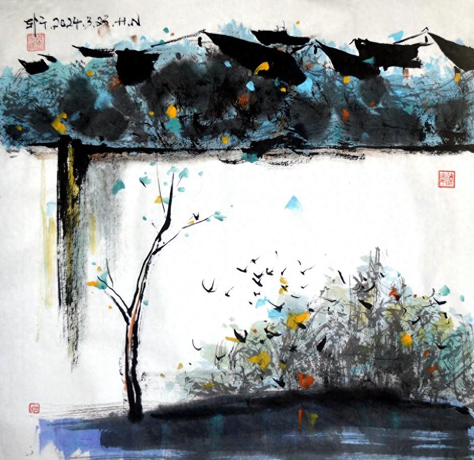 一切都進入繪畫的意識流裏算是進入狀態了,畫出來的作品就會超凡脫俗的有些意境與想象的空間存在。我喜歡這樣的繪畫境界,它給予我充分的自我發揮而畫筆遊離於流水流心的感覺,盡情的投入盡情的表達,直至畫筆雖然已停心情卻意猶未盡依然帶着衝動躍躍欲試,不把這情緒消耗掉心難平靜下來。好激動不好,對身體有損傷,但是,藝術表現力沒有激動又何來的感染力呢?一幅作品作者自己都沒有激情揮灑卻怎麼能讓他人看到你的畫心潮澎湃激動不已呢?