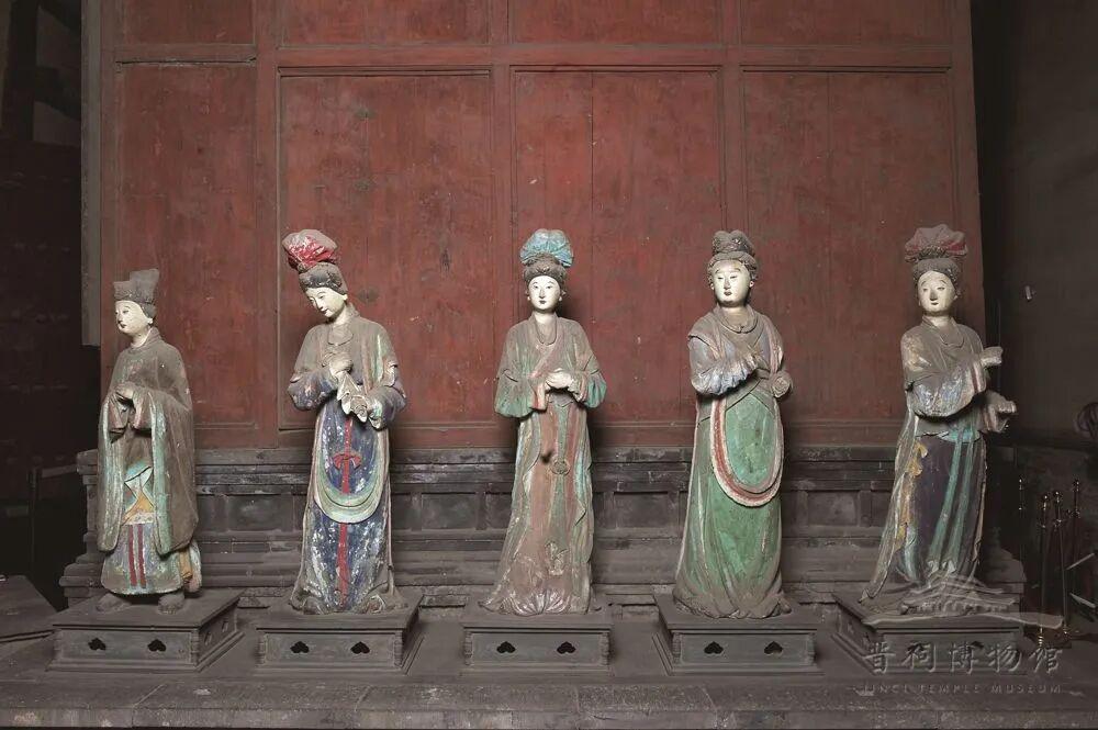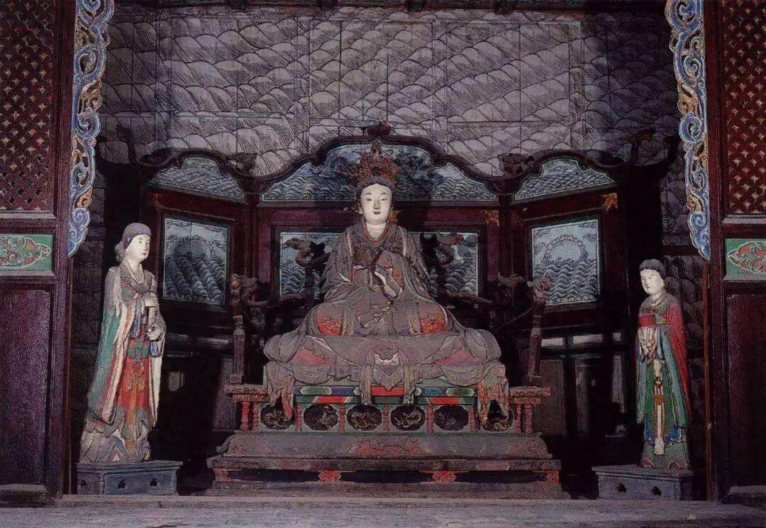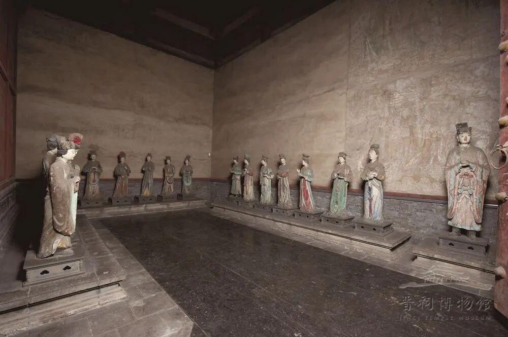 聖母殿內有栩栩如生的43尊彩塑(42尊侍女與宦官像),如真人一般大小,比例準確,姿態自然,是根據宋代宮廷“六尚制”塑造的,對於研究宋代宮廷生活有着重要的作用。