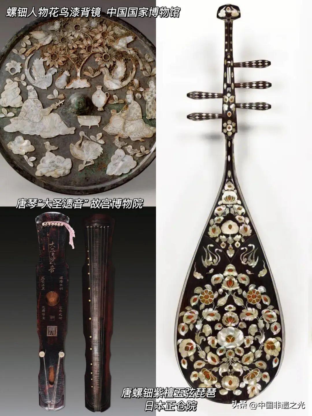 這一時期,將髹漆與金屬鑲嵌相結合的金銀平脫工藝、將貝殼打磨成各種圖案鑲嵌於器物表面的螺鈿工藝,都被廣泛運用到鏡子、古琴和琵琶的製作當中,並相繼傳往日本奈良時代、韓國新羅王朝。