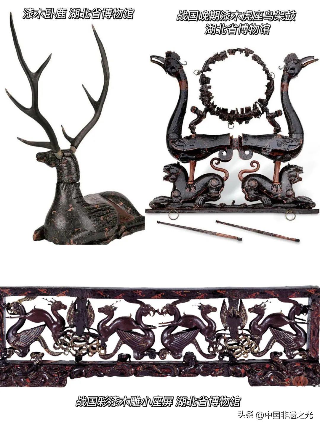 而到了戰國,第一個漆器藝術高峯出現了,薄胎、卷木胎、夾紵胎等胎骨做法、描金、鏤雕、金屬扣等裝飾技藝層出不窮,爲我們貢獻出彩繪雙虎雙鳳紋漆鼓架、戰國彩漆木雕小座屏等文物精品。