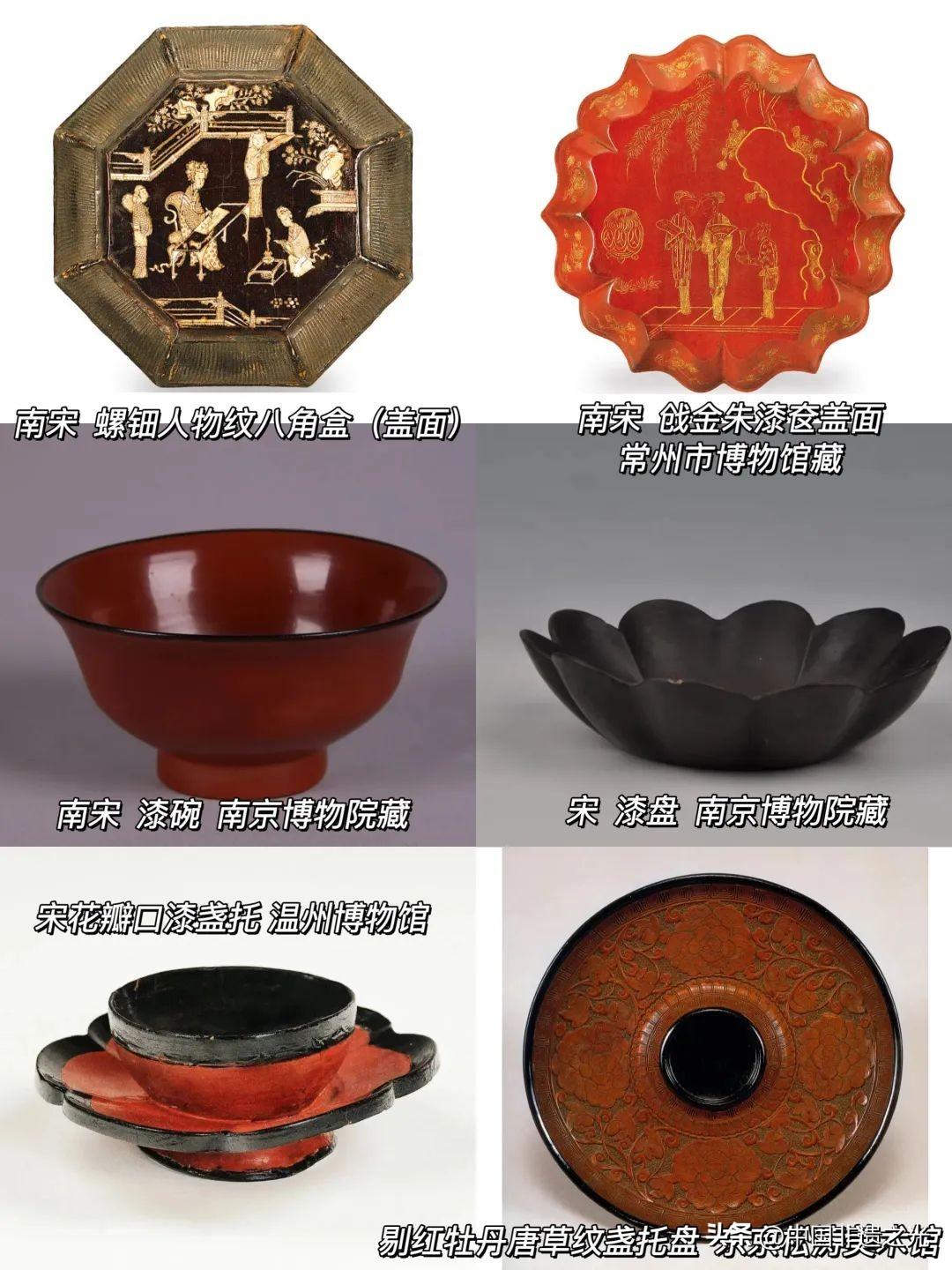 在宋朝,以素色靜謐爲主的單色漆大行其道,此外,在一定厚度的漆上進行雕刻的漆雕工藝、用漆或油調灰堆出花紋的漆堆工藝、在漆的表面刻出線槽,貼以金箔並研磨的戧金工藝都發展得爐火純青。