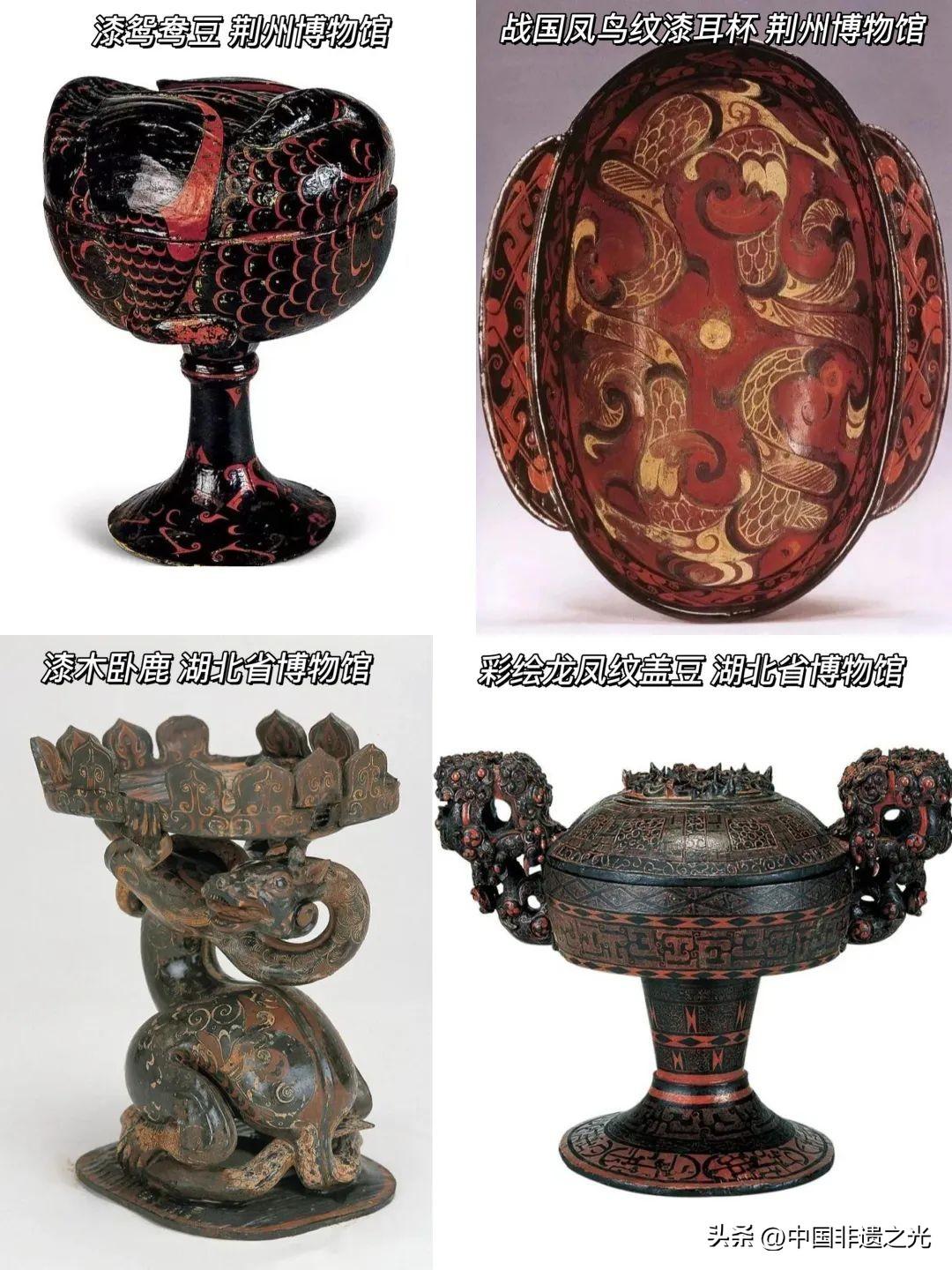 商周時期,漆器被用於樂器、兵器和禮器,裝飾方面也有了填漆、彩繪、貼金、鑲玉、蚌泡鑲嵌等工藝。