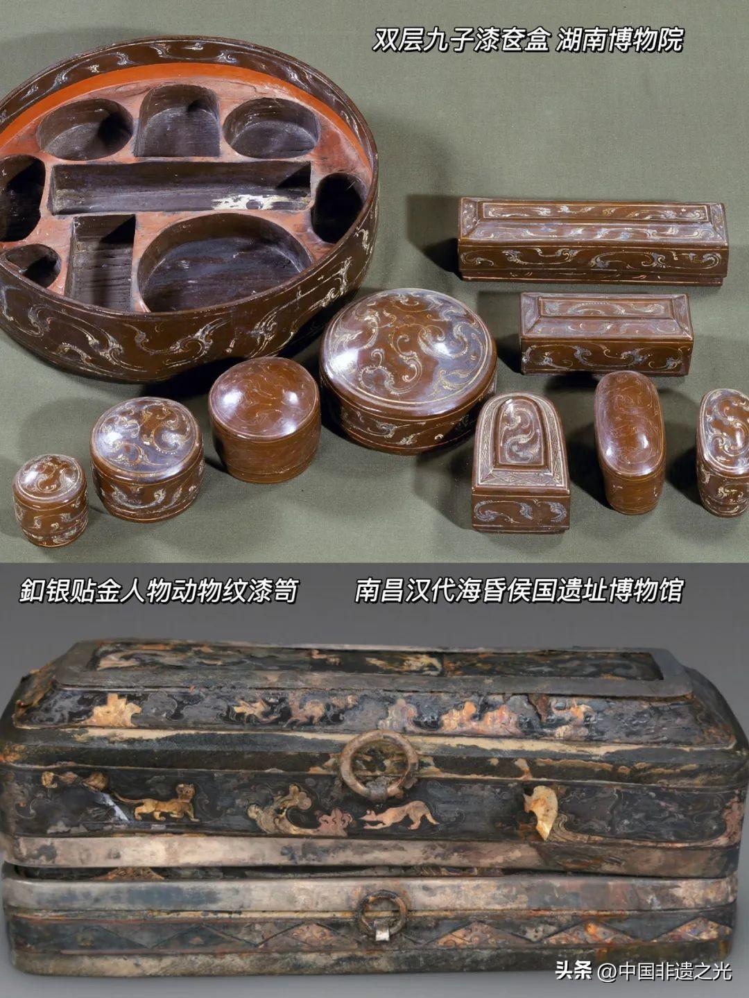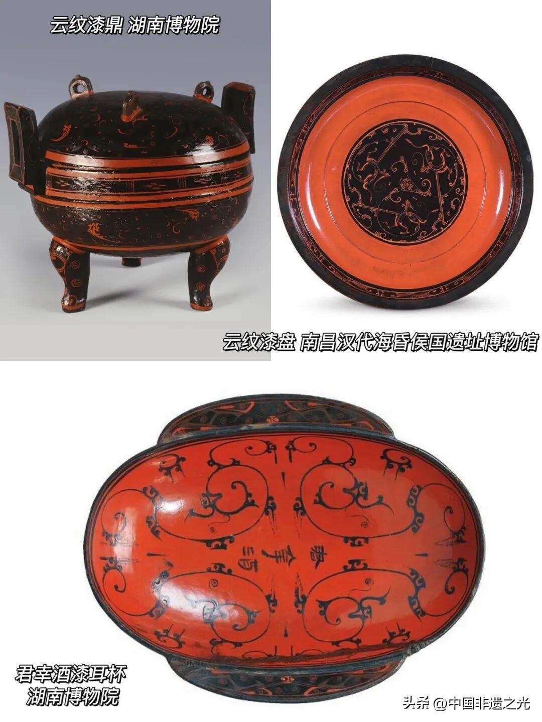 漢代迎來了第二個漆器藝術高峯。以馬王堆、海昏侯墓爲例,不僅有大型的漆鼎、漆棺、也有日常的漆盤、耳杯、盒奩等物件,它們造型優美,紋飾飄逸,頗受貴族階層們的喜愛。