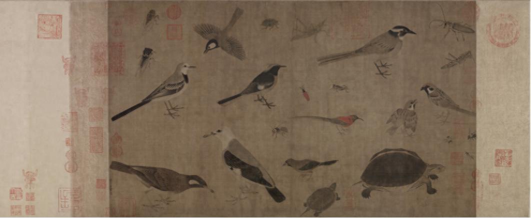 在故宮博物院的珍藏中,有一幅看似“未完成”的絹本設色畫——《寫生珍禽圖》。這幅縱41.5 釐米、橫 70.8 釐米的手卷,畫面均勻分佈着 24 只生靈,包括鳥雀、昆蟲與龜類。整幅畫看似全無構圖,比起繪畫,更像是設計師常用的國風工筆禽鳥素材合集。