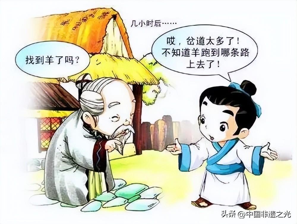 【大意】楊朱的鄰人丟失了一隻羊,他率領全家老小,又請楊朱派童僕幫助一齊追尋。楊朱說:“哈!丟失一隻羊,爲什麼要這麼多人去追呢?”鄰人回答:“岔路太多了。”追的人返回後,楊子問:“羊找到了嗎?”鄰人回答:“跑掉啦!”楊子問:“怎麼會跑掉呢?”回答:“岔路上又有岔路,我不知道該往哪條路去找,所以只好回來了。”