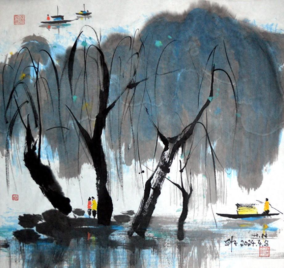 柳枝彎彎搖擺不停,讓人舒心又愜意,就彷彿看到一個女孩劉海被微風輕輕地吹動着而散發出迷人的魅力一般,盪漾春心。畫面要有美好的想象推動力使得人們的被動變爲主動去想象與追尋着藝術表現的感官世界,享受那夢幻般的無與倫比美妙的意境。藝術表現就是要呈現出高規格的視覺感官享受,否則藝術表現了什麼?以及值得人們去欣賞與陶冶提高?只不過是個自我表現而已!