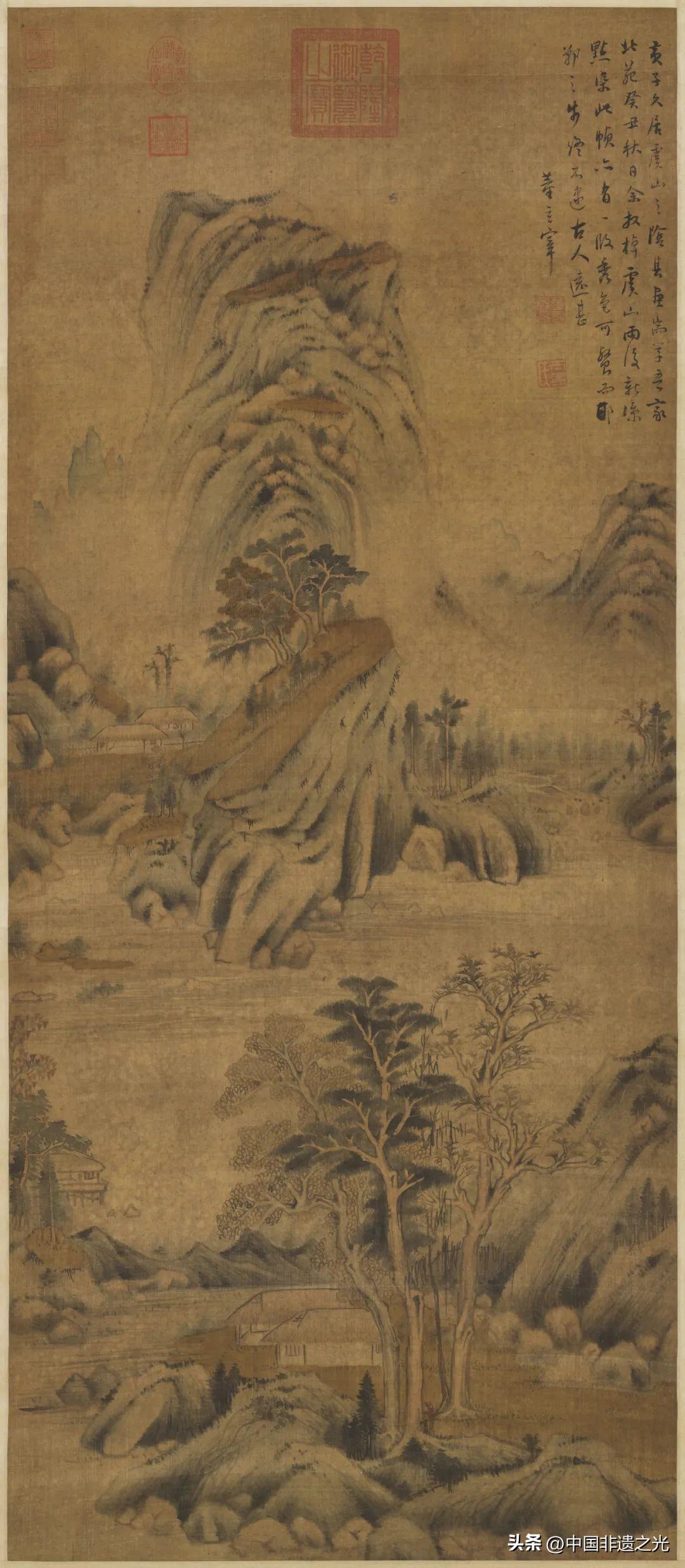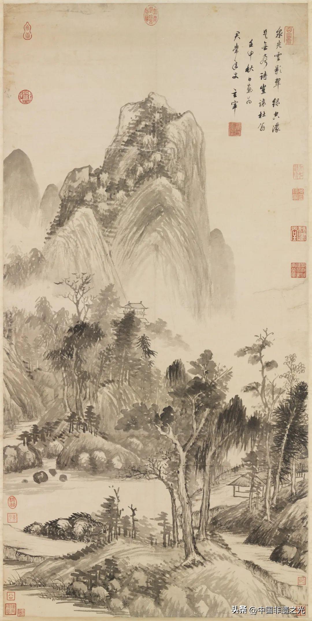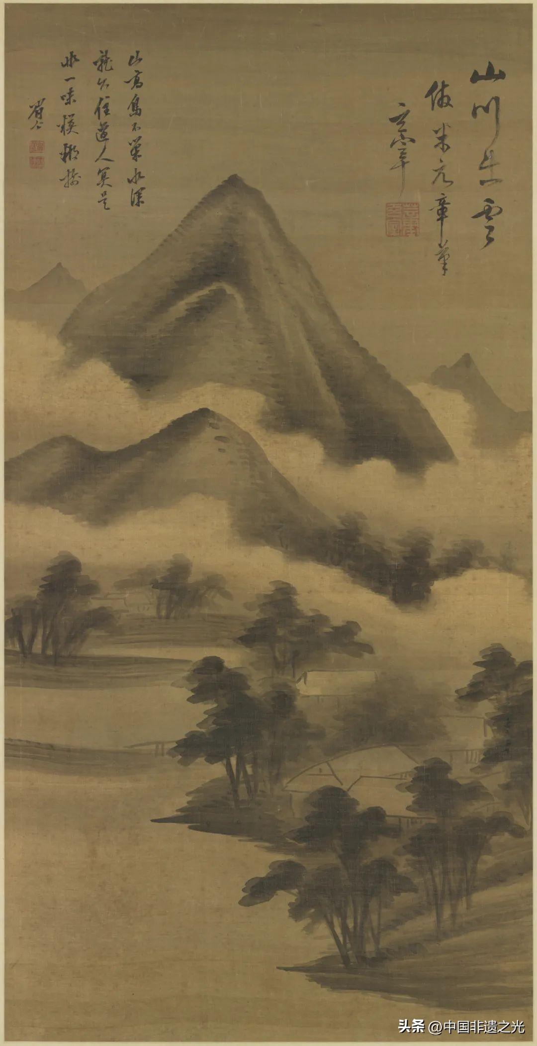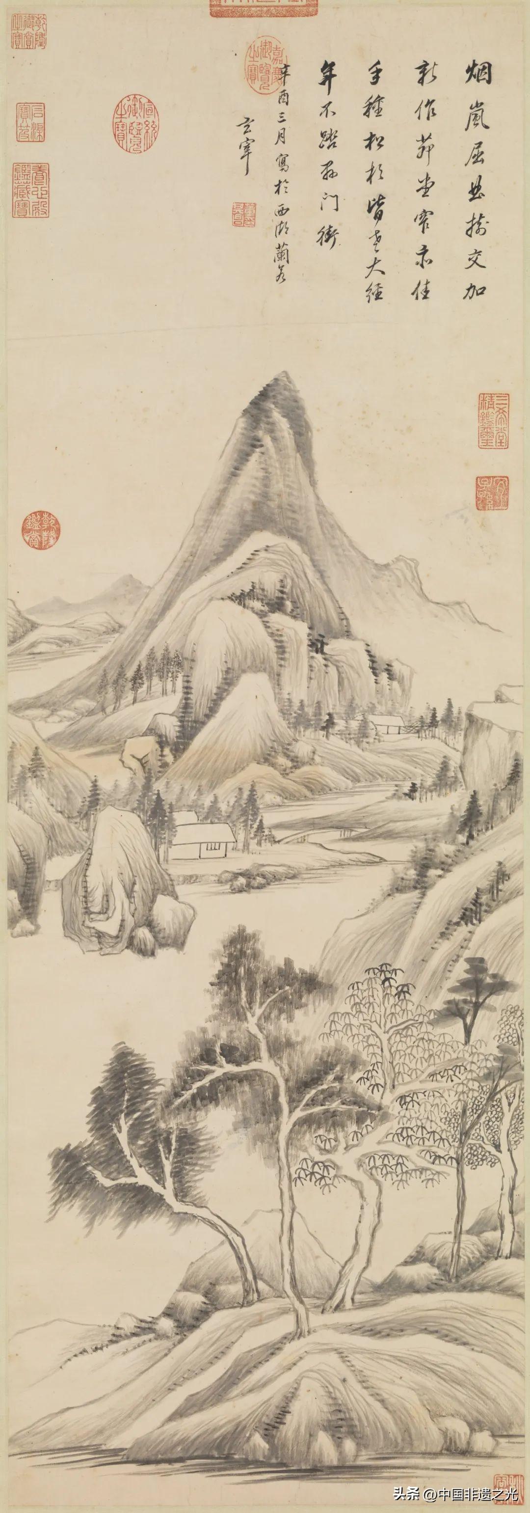 圖中遠處雲霧縹緲,與羣山融合一體;山脈連綿不絕,樹木鬱鬱蔥蔥;近處山谷中數座房屋隱於此,如若世外桃源。技法上,雲之繪法有米氏之韻,雲頭以墨色暈染,間或白色,有種翻滾變幻的動感。