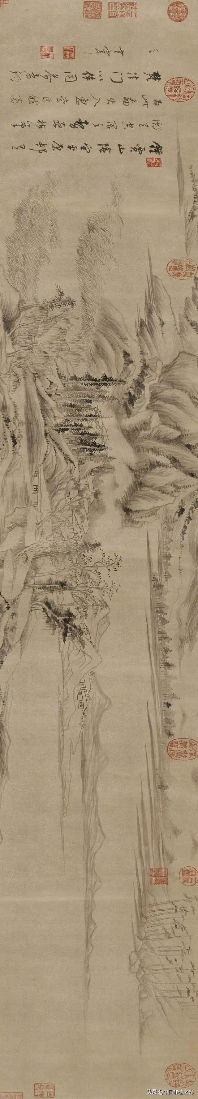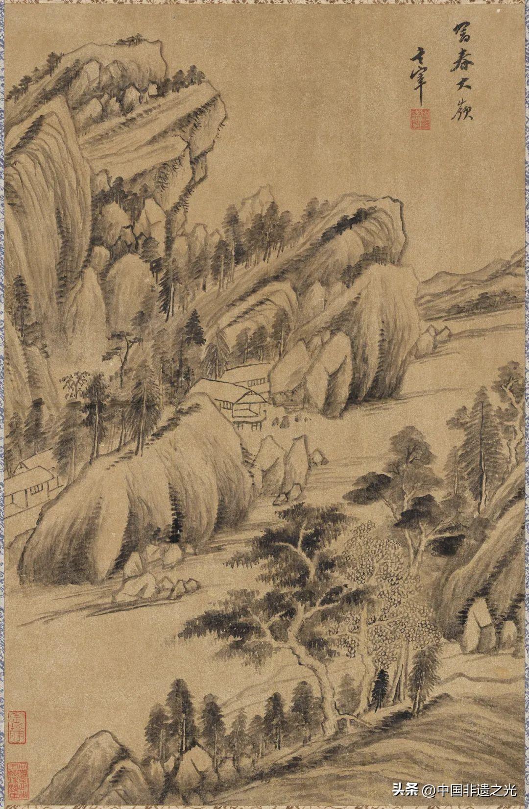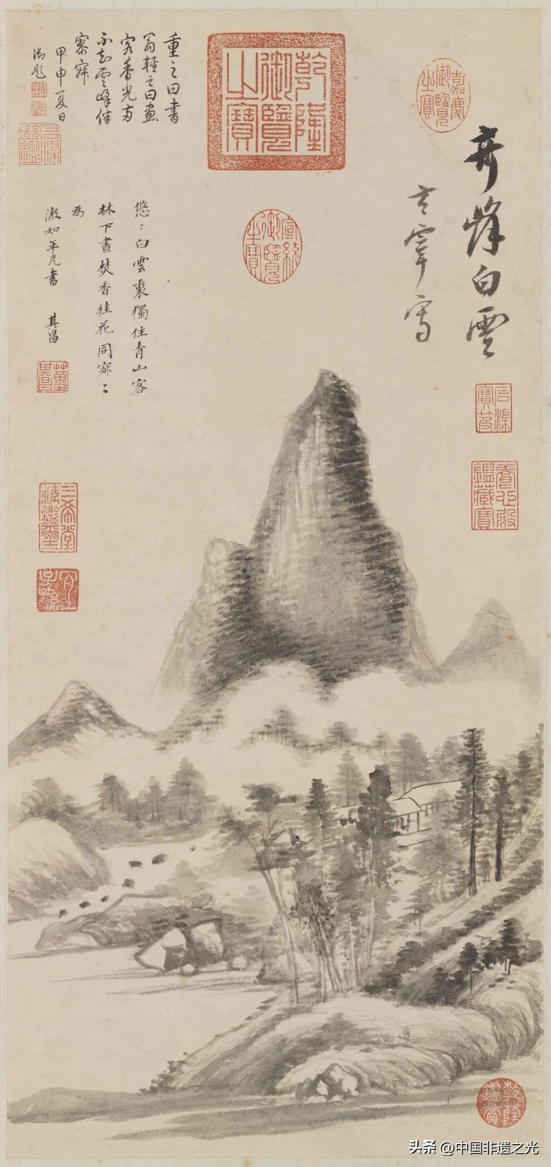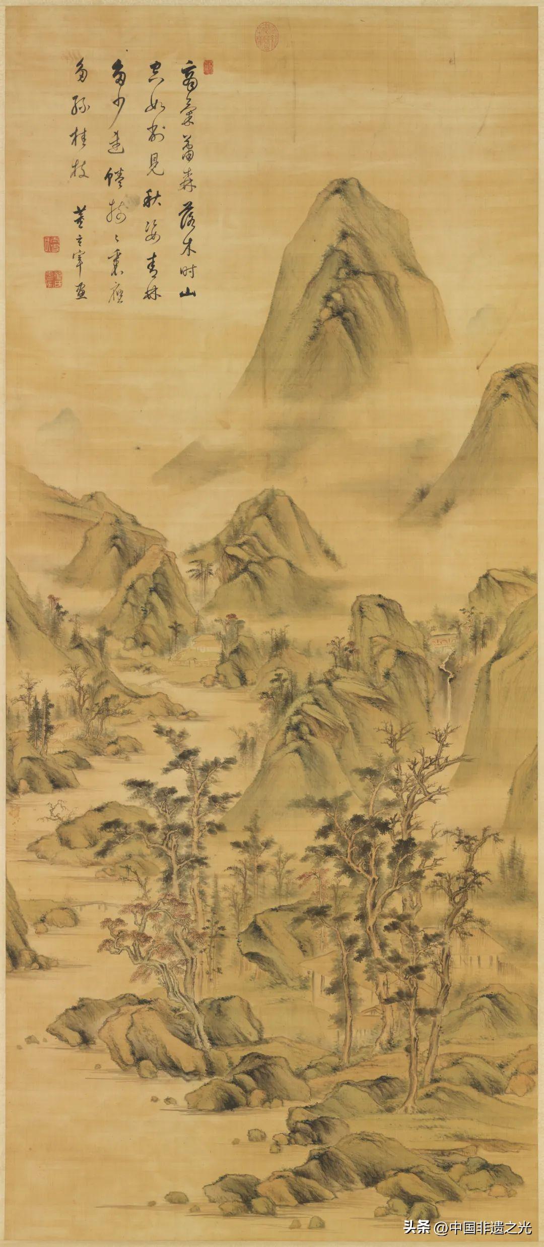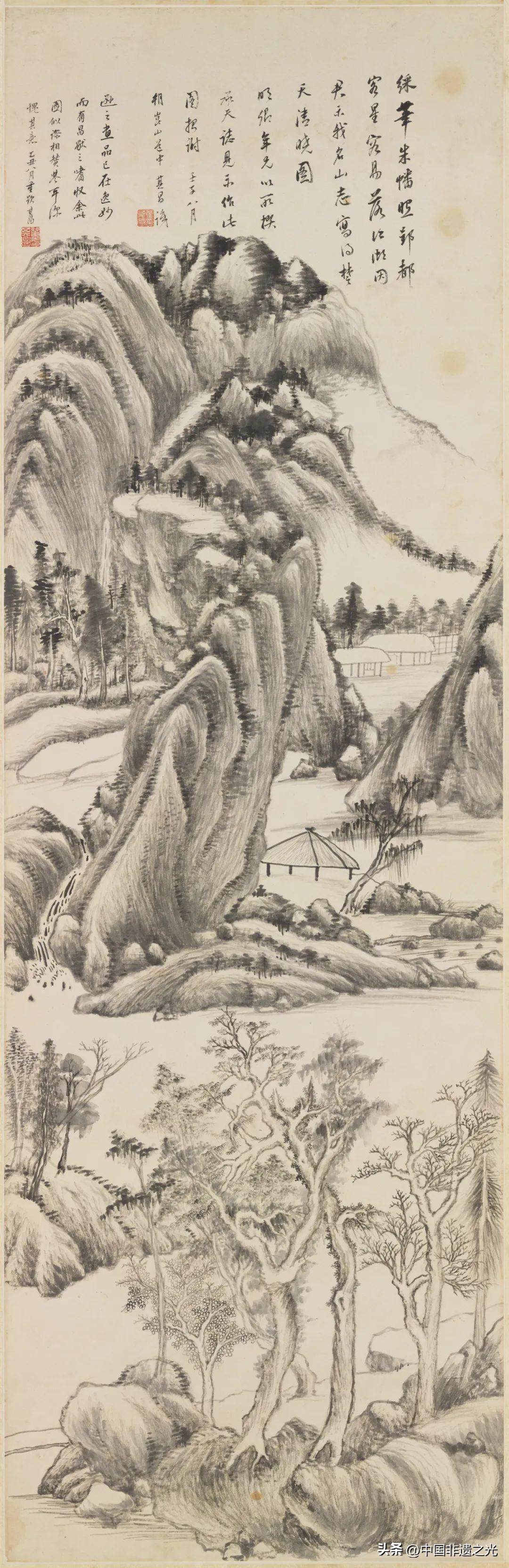 圖中遠處雲霧縹緲,與羣山融合一體;山脈連綿不絕,樹木鬱鬱蔥蔥;近處山谷中數座房屋隱於此,如若世外桃源。技法上,雲之繪法有米氏之韻,雲頭以墨色暈染,間或白色,有種翻滾變幻的動感。