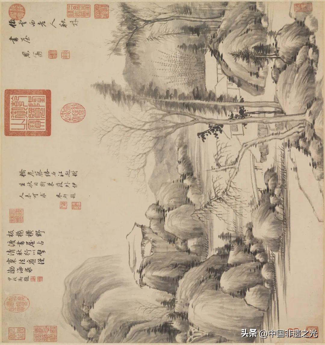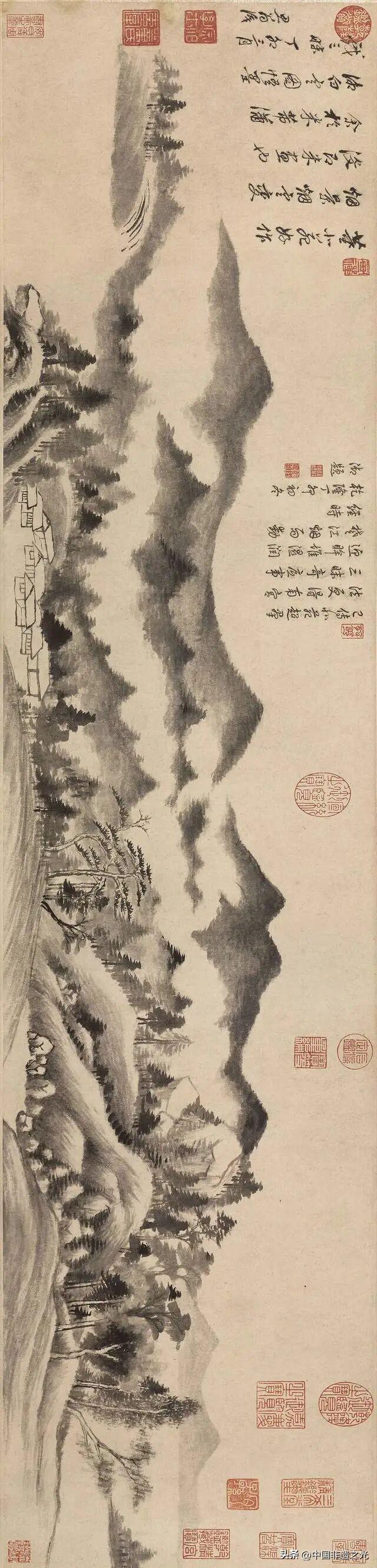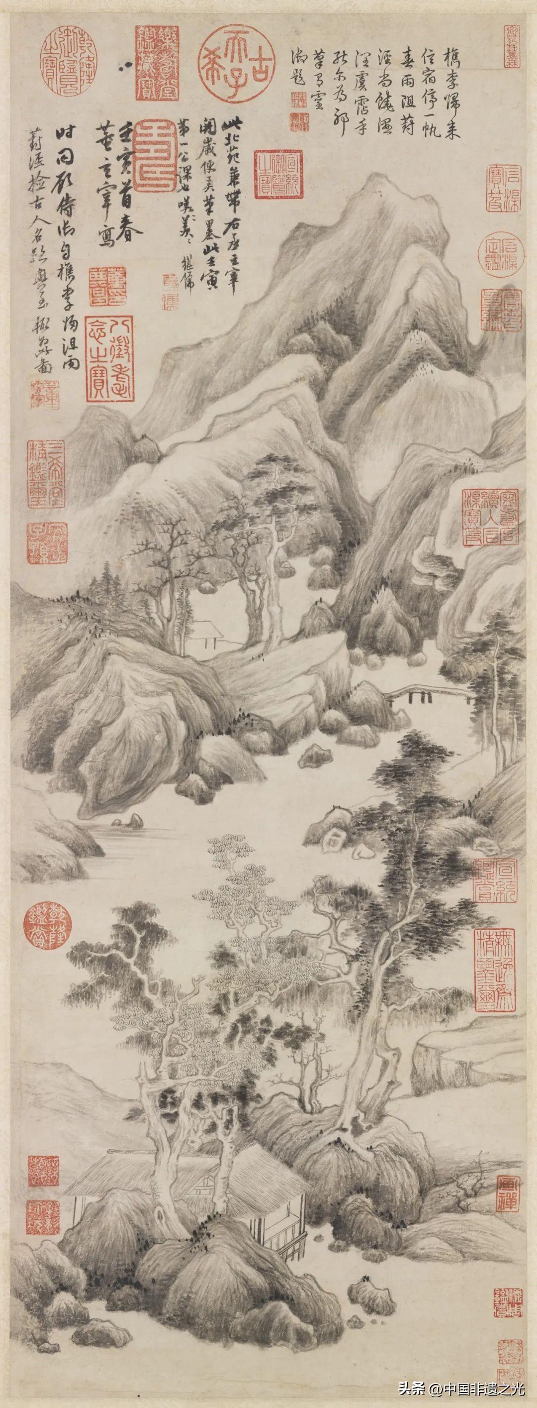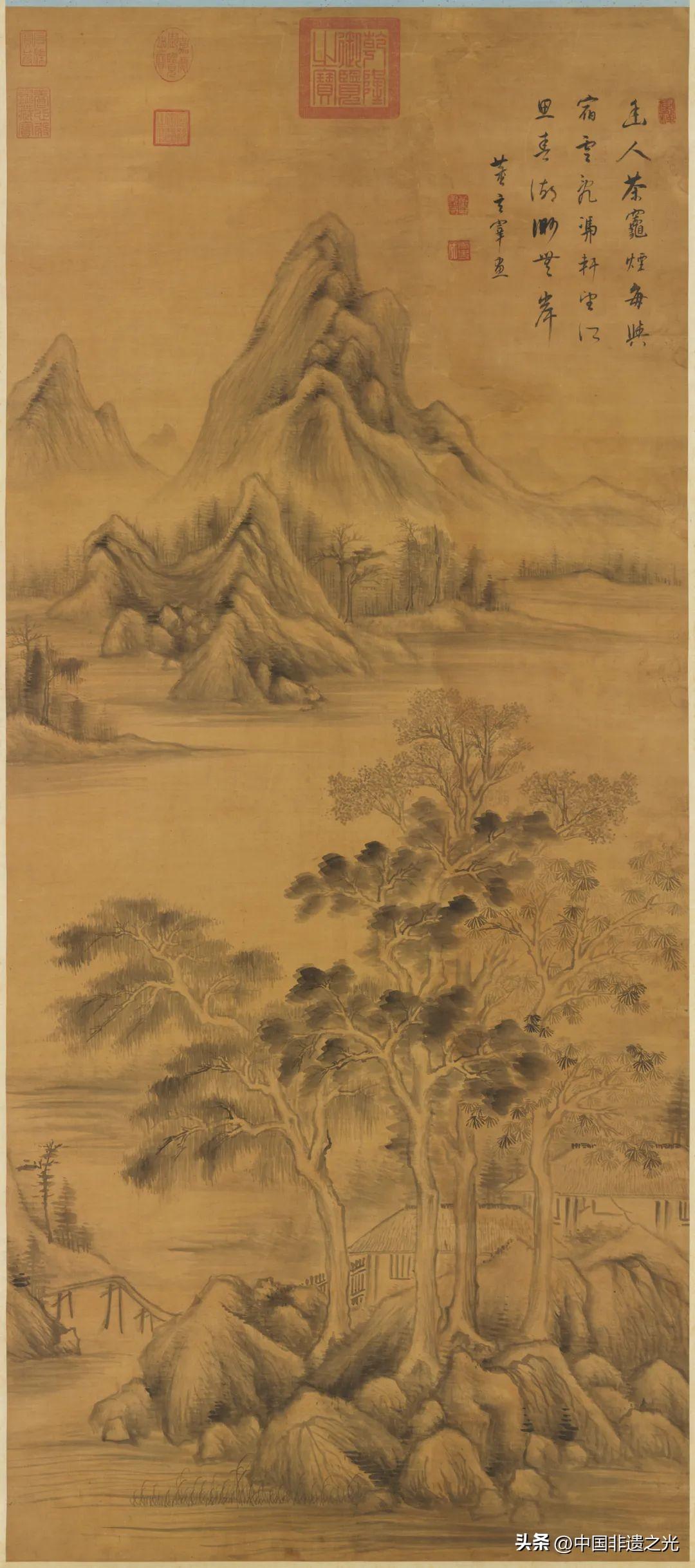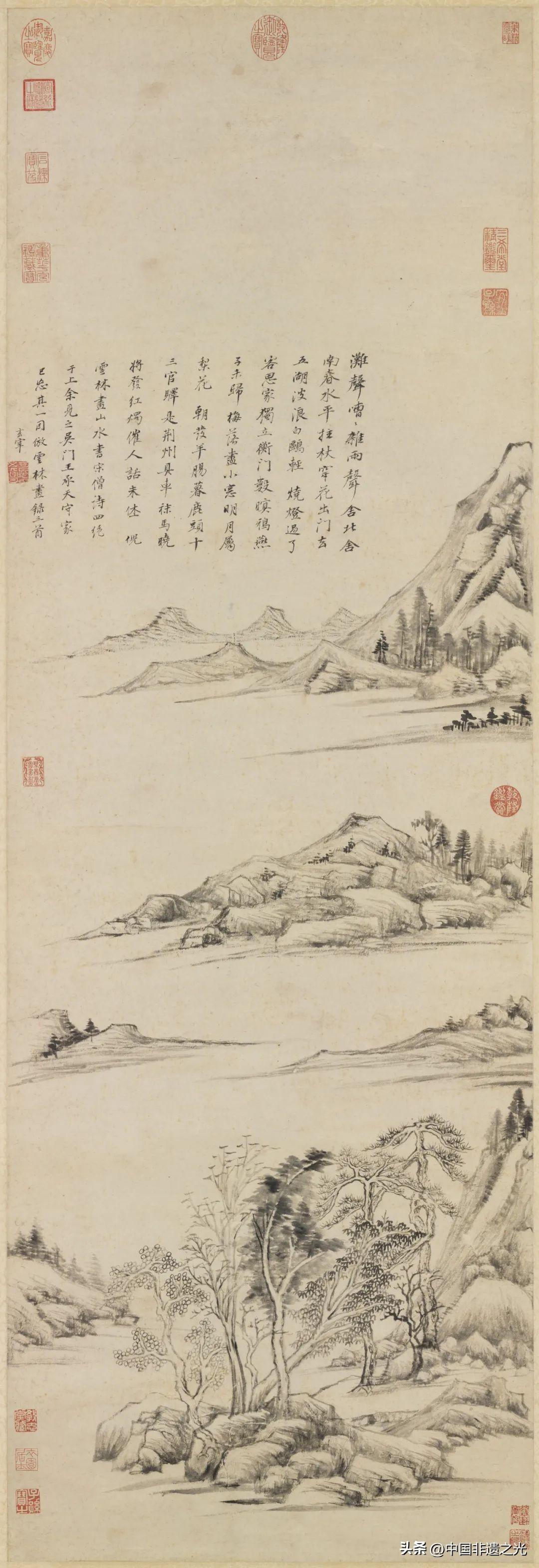 此卷繪層林參差,樹木繁茂,山巒錯落,青峯連綿,板橋臥波,屋舍隱現,遠方雲煙氤氳,湖天一色。”畫中山石用中鋒細筆勾寫輪廓,繼以短筆濃點或臥筆長皴表現其陰陽向背。畫樹運筆率意,注重枝枒曲直姿態。構圖平遠開闊,呈現出江山無盡的悠遠之趣。
