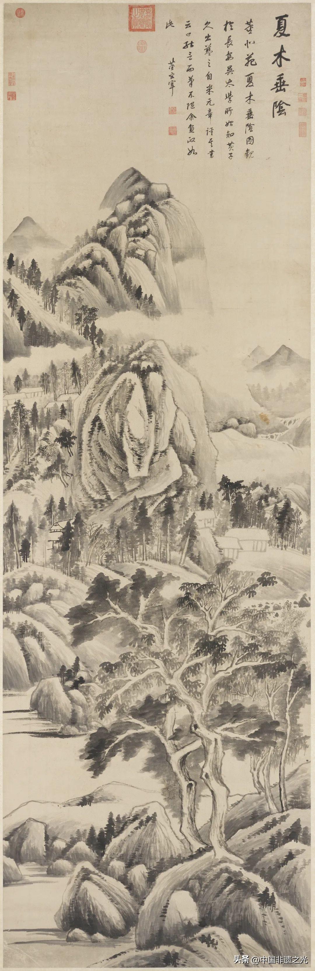 夏木垂陰。董北苑夏木垂陰圖。觀於長安吳太學所。始知黃子久出藍之自。米元章評其書雲。口能言而筆不隨。餘畫政如此。董玄宰。