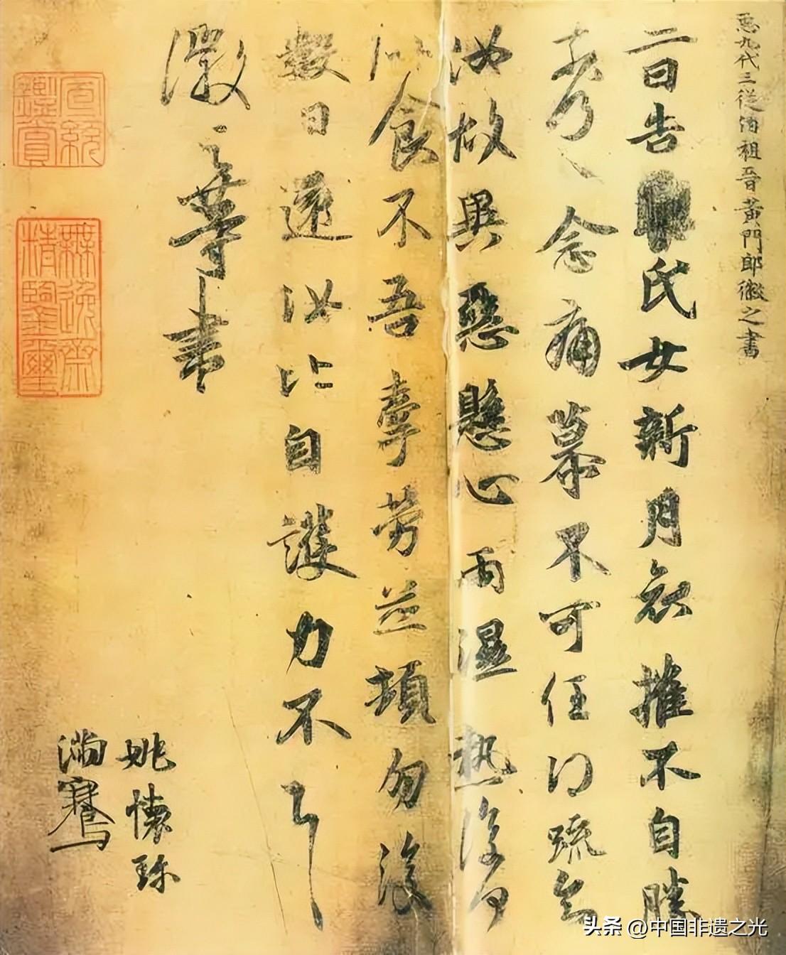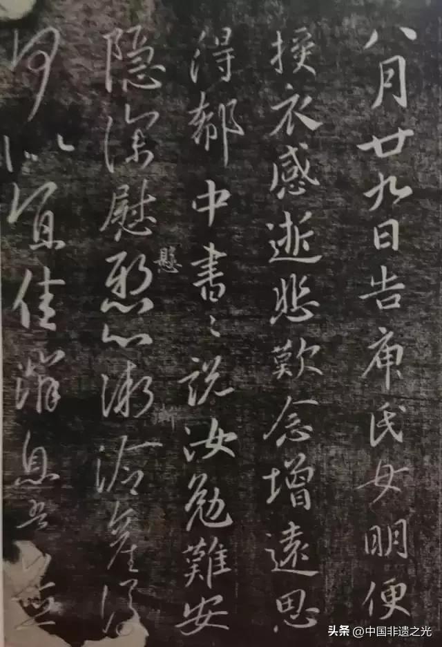 此帖以行楷爲主,揮灑自如,筆法多變,妍美流暢。釋文:臣九代三從伯祖晉黃門郎徽之書。二日,告□氏女,新月哀摧不自勝,奈何奈何。念痛慕,不可任。得疏知汝故異惡懸心,雨溼熱復何似,食不?吾牽勞並頓,勿復,數日還,汝比自護。力不具。徽之等書。姚懷珍,滿騫。
