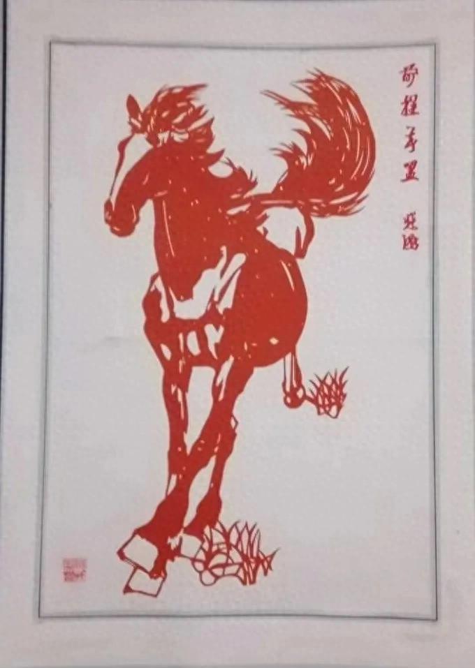 這幅“前程萬里”,鬃毛飛揚、四蹄生風,像要衝破紅紙奔向遠方。馬的肌肉線條被剪得利落分明,連蹄下的草石都透着勁道,旁邊的題字更是點睛:“前程萬里”的期許,那是看得見的前進動力。