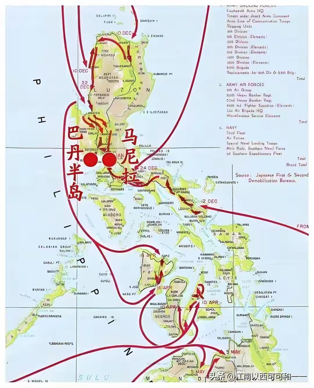 - 侵略過程:1941年12月8日,日軍空襲菲律賓美軍基地,12月22日登陸呂宋島。美軍與菲律賓軍隊退守巴丹半島與科雷吉多爾島,進行頑強抵抗。1942年5月,菲律賓全境淪陷;1944年10月,美軍反攻菲律賓,經過萊特灣海戰、馬尼拉戰役等慘烈戰鬥,1945年7月收復全境。