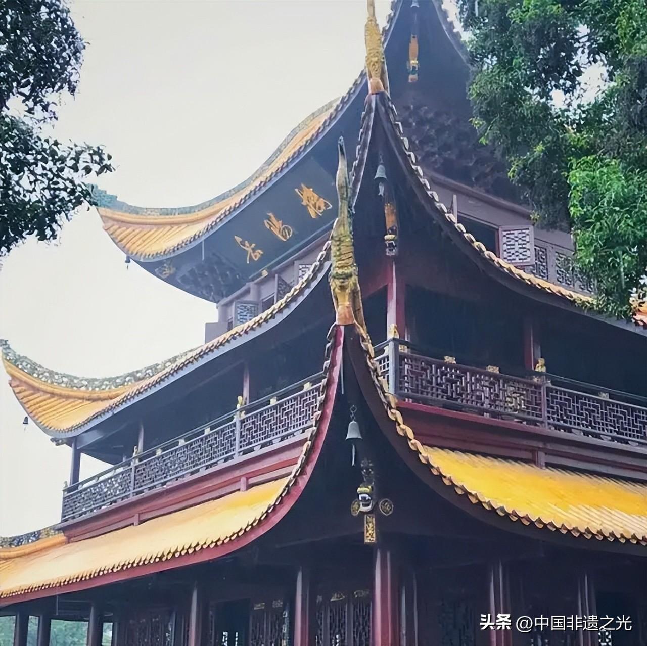 屋檐四角飛翹,如鳥展翅,由各種中國古典動物走獸圖案組層的獸吻在琉璃瓦屋面的襯托下,給人以古樸、典雅、層次分明之美感。高處的寶頂在陽光下熠熠閃光,使這座古建築更散發出金碧輝煌的魅力。